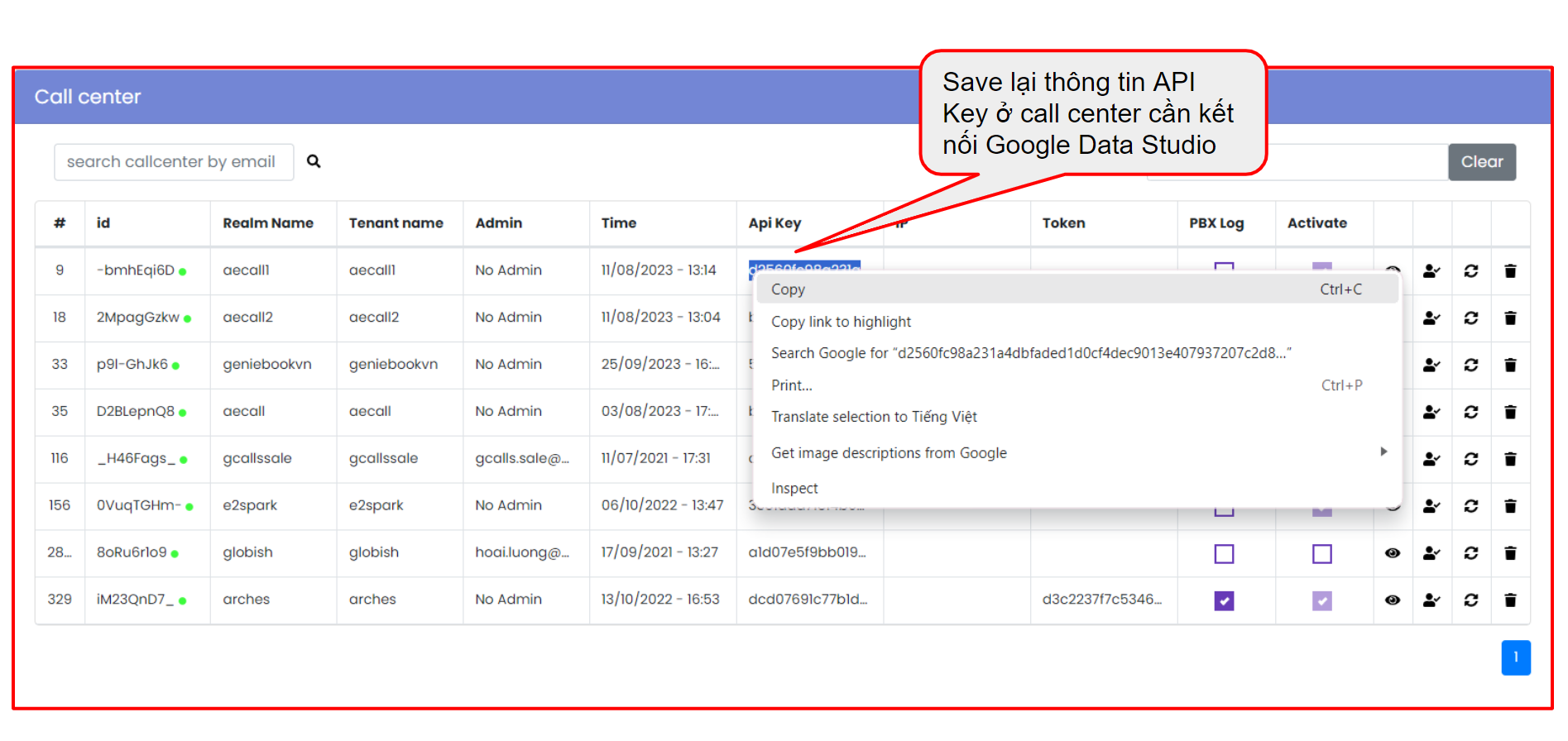 [Chưa xong] Hướng Dẫn Kết Nối Google Data StudioOn this page[Chưa xong] Hướng Dẫn Kết Nối Google Data Studio1. Thao tác trên PortalTiến hành truy cập Portal và chọn đúng call center cần triển khai dịch Google Data Studio và lưu lại API Key2. Thao tác trên Google Data Studio3. Kết luận