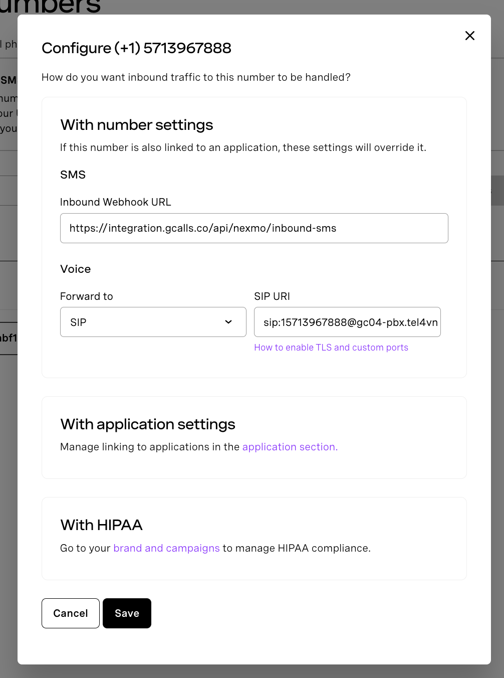 - Chọn số điện thoại cần tích hợp và thêm thông tin inbound webhook là: https://integration.gcalls.co/api/nexmo/inbound-sms