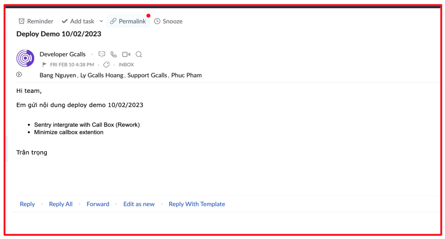 Ví dụ: Một email thông báo về việc deploy lên server demo từ kỹ thuật*