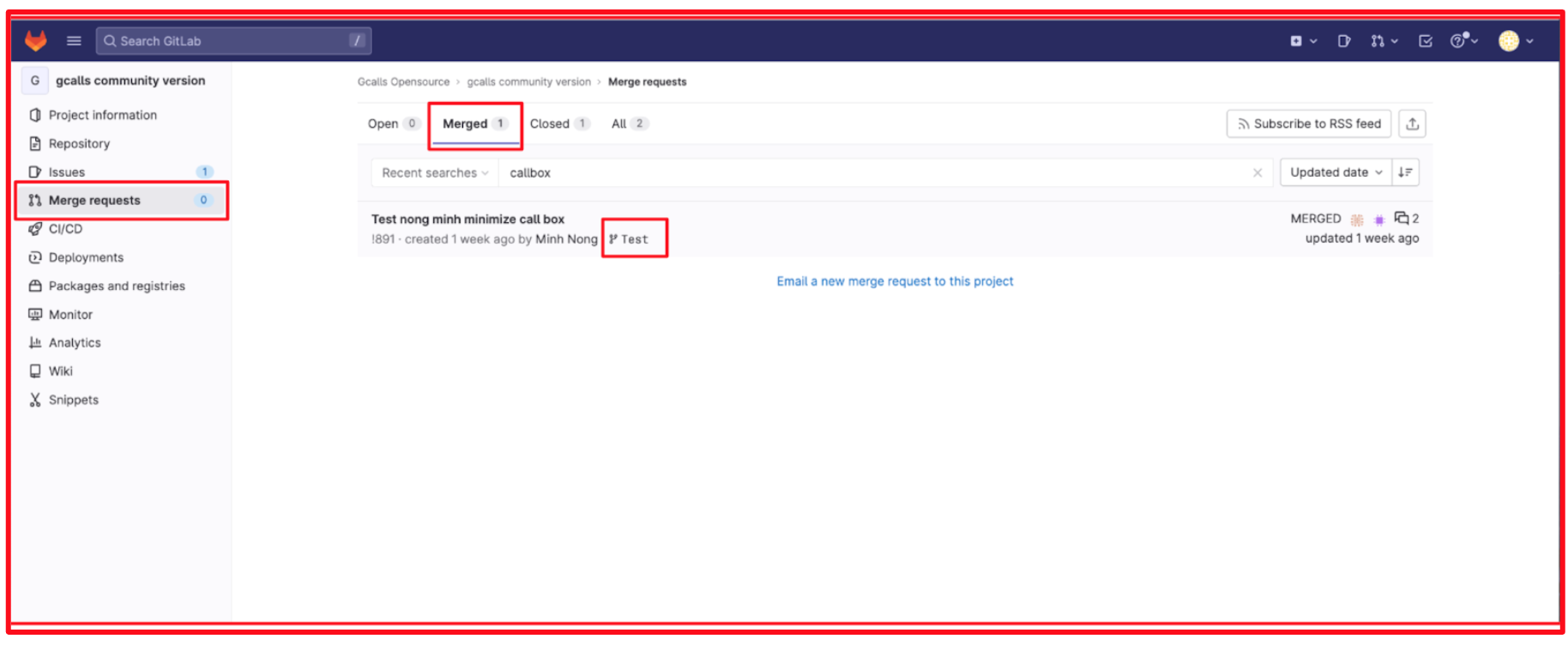 Sau khi nhận được email từ kỹ thuật => CS tiến hành đăng nhập vào Gitlap => chọn Merge requests => chọn tab Merged => tìm những request đang để là Test theo nội dung trong email kỹ thuật đã gửi để thực hiện testing.
