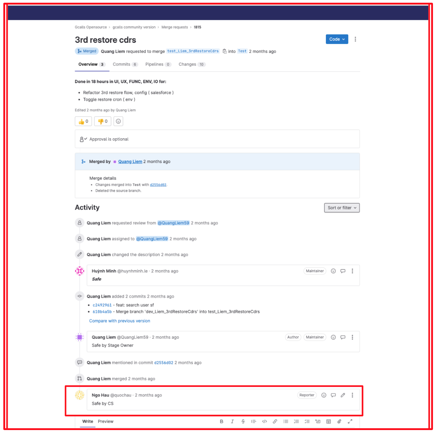 - Hằng tháng vào tối ngày 1 và 15, bộ kỹ thuật sẽ deploy các cập nhật hệ thống mới lên server production. Vào các ngày trước đó, bộ phận kỹ thuật sẽ đưa những bản cập nhật đó lên server demo trước. Tất cả các cập nhật sẽ tập trung ở Gitlap, CS sẽ vào Gitlap, và kiểm tra ở phần merge request những vấn đề cập nhật đang để là Test và thưc hiện việc testing.