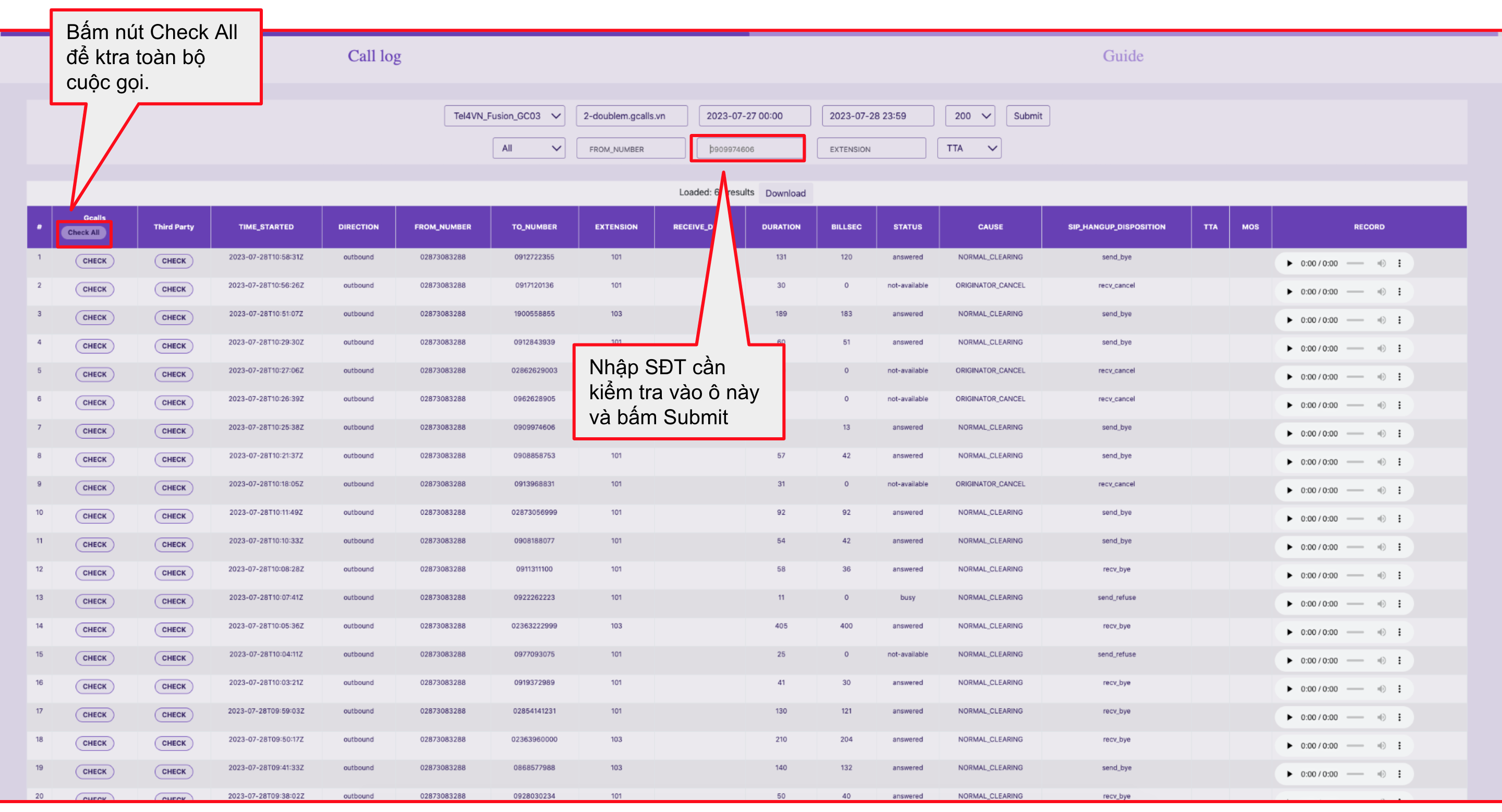 - Sau khi bấm nút submit, sẽ hiển thị ra lịch sử cuộc gọi trong thời gian cần check
