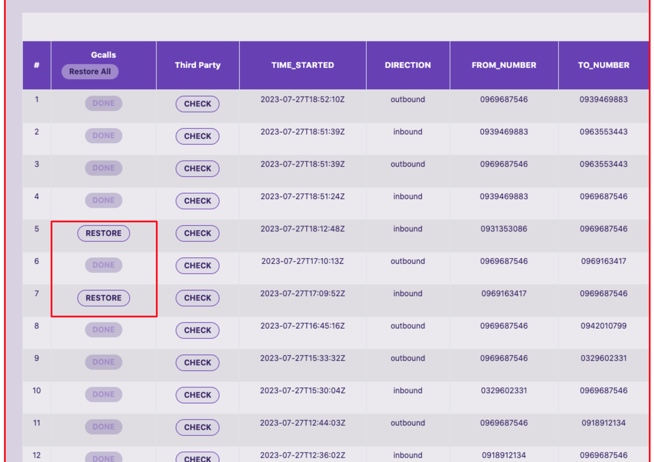 - Bước tiếp theo, hãy copy SĐT điện thoại ở dòng RESTORE đăng nhập vào web app Gcalls của KH và double check xem có đúng là bị mất không. Nếu đúng là bị mất thì bấm restore để phục hồi cho khách hàng.
