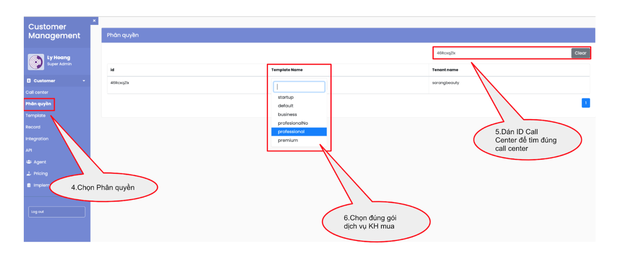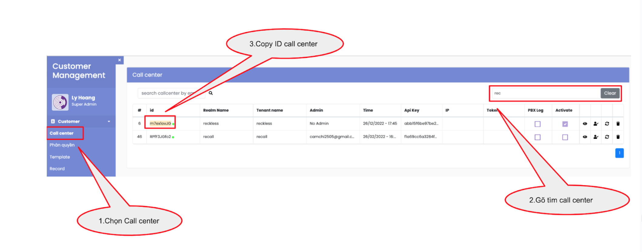 - ID Tenant: ID của call center. Ví dụ: r1gbx5ln@