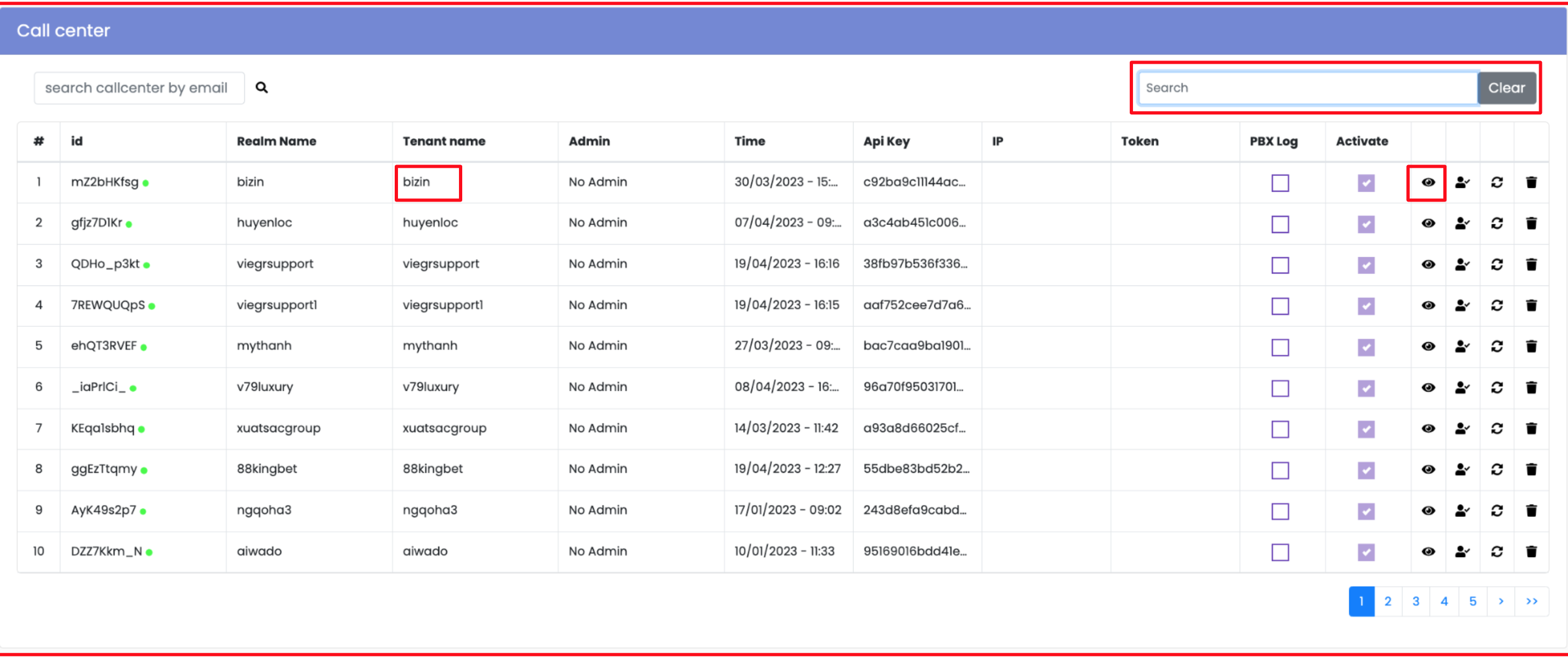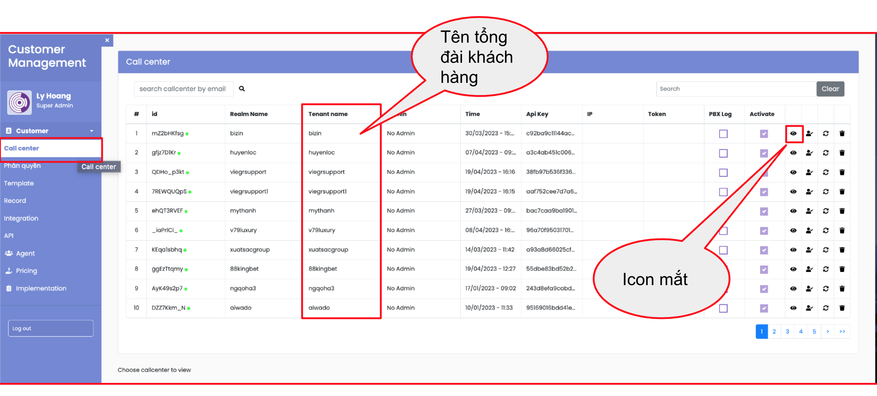 Bấm vào biểu tượng con mắt của một nền tảng bất kỳ để xem có những tổng đài của khách hàng nào đang được tích hợp với nền tảng đó.