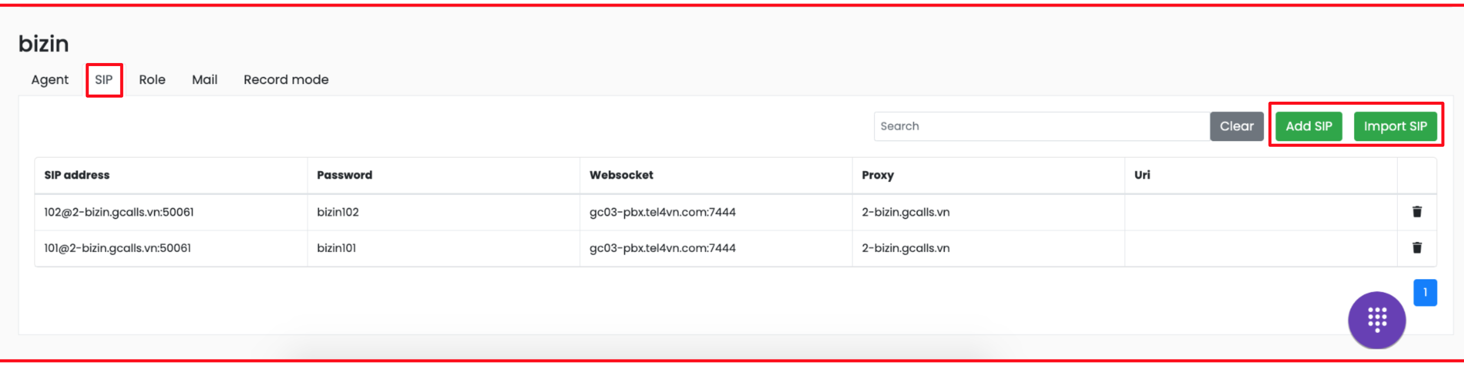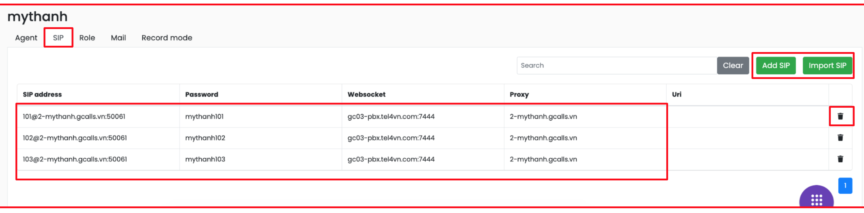 - Xoá SIP: bấm icon thùng rác