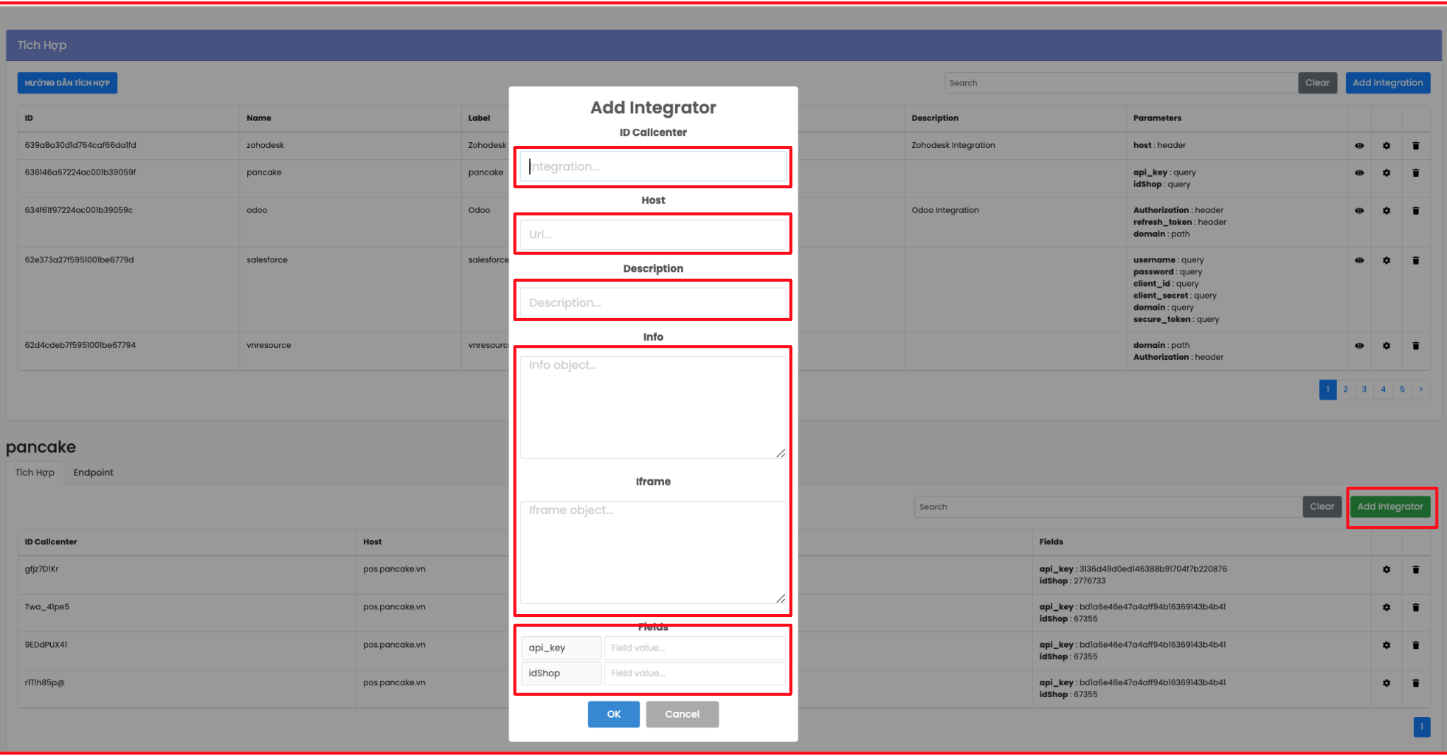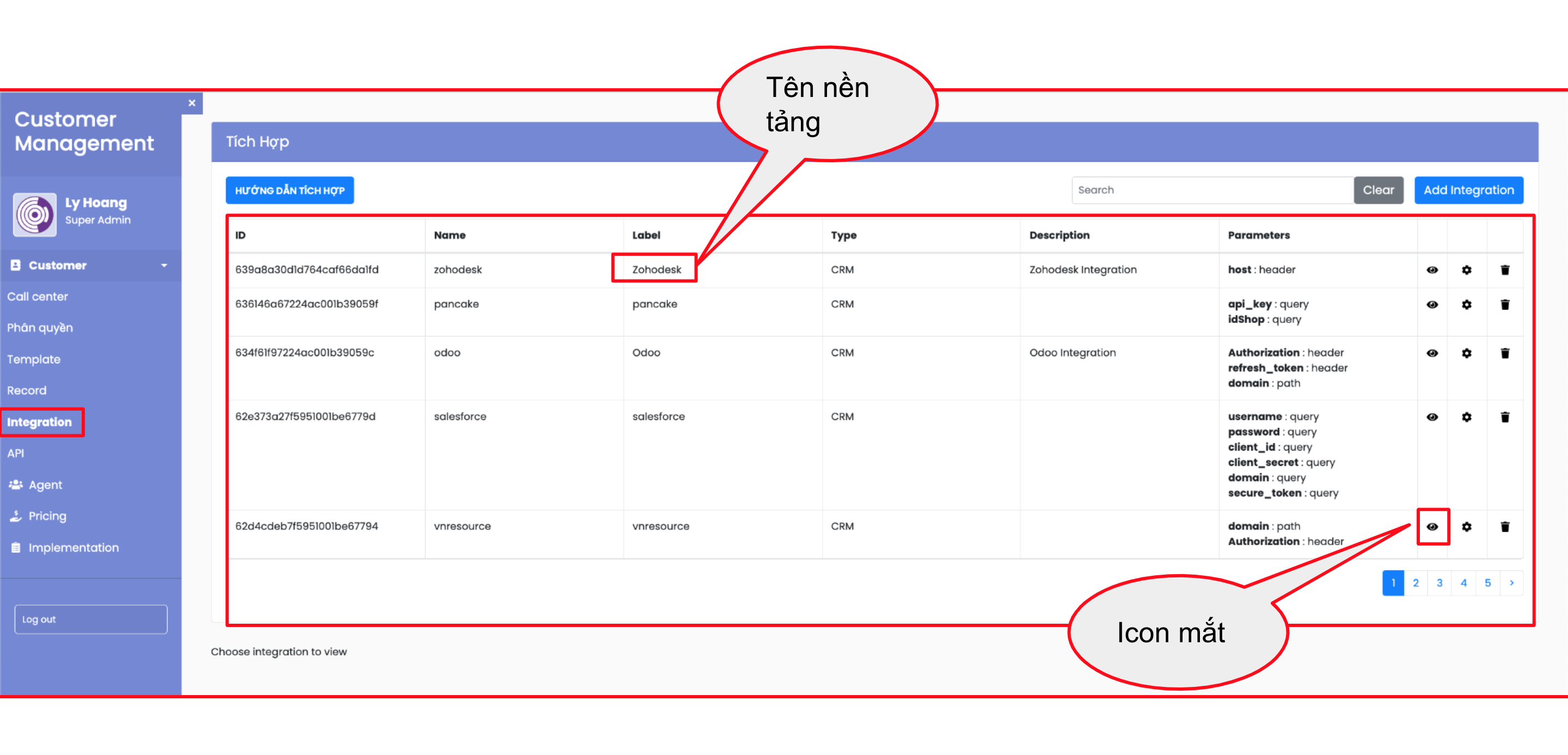 - Để tích hợp, bấm Add Integrate ở nền tảng đang bấm vào icon mắt để xem. Ví dụ, cần add Pancake cho một call center: