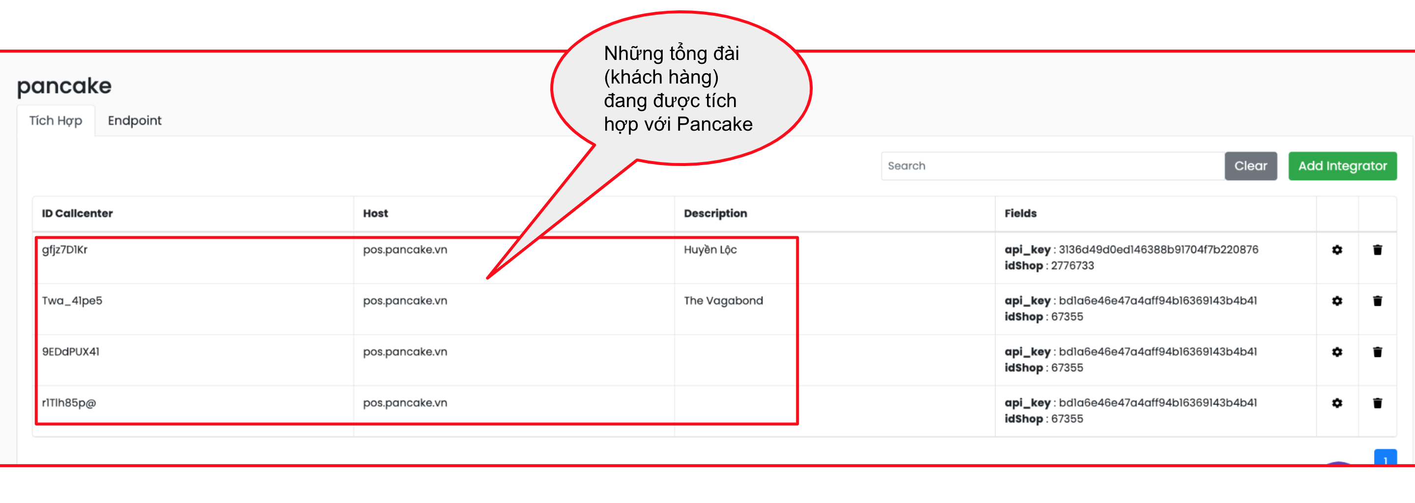 Ví dụ, bấm vào icon mắt ở Pancake và xem ở phía dưới - những tổng đài (khách hàng) nào đang được tích hợp với Pancake.