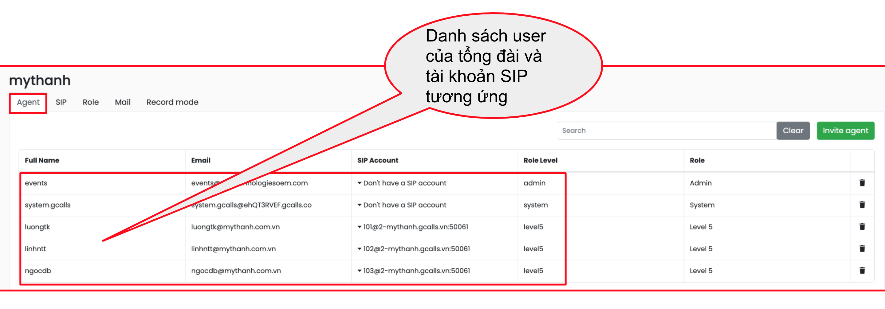 Bấm vào biểu tượng con mắt của tổng đài cần kiểm tra, ví dụ mythanh, ta thấy: