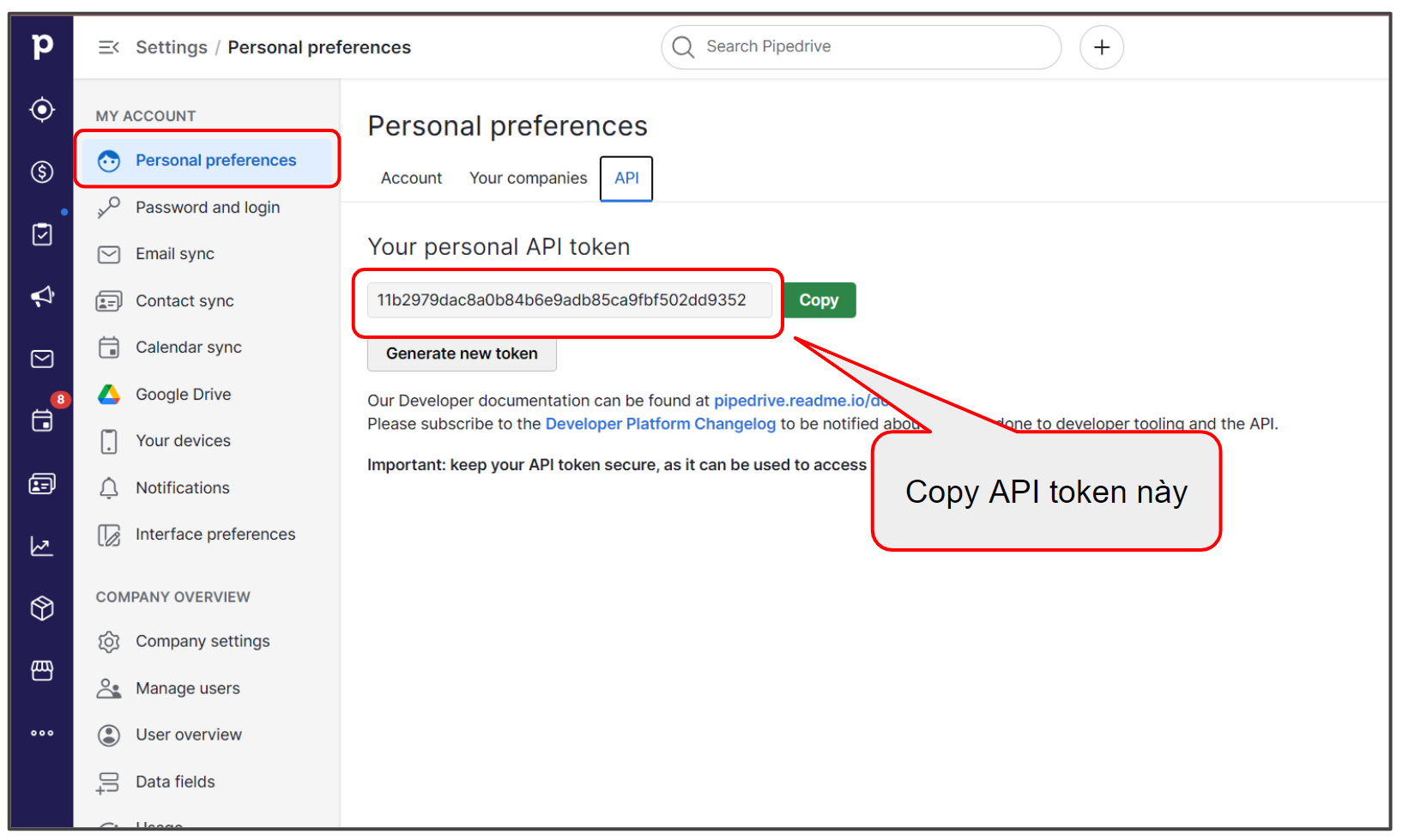 - Chọn phần Người Dùng -> chọn tab Settings -> chọn tab Personal Preferences -> chọn tab API và copy phần token đó.