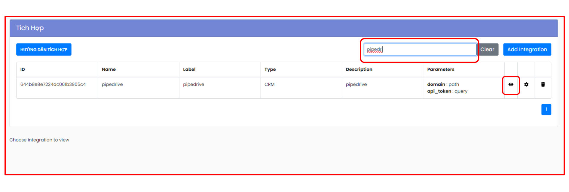 - Search tìm nền tảng Pipedrive => chọn icon mắt