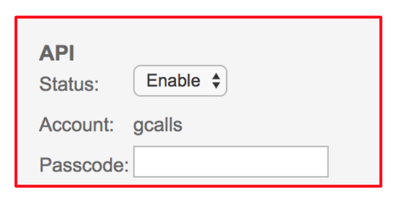 Bước 3: Ở mục API, “Status" ở chế độ “Enabled", sao chép Account và Passcode gửi cho Gcalls. Hình minh hoạ bên dưới: