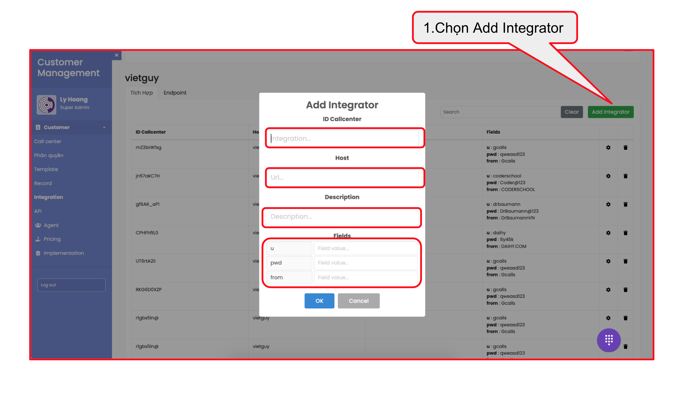 Tiếp theo, chọn Add Integrator và thực hiện nhập vào các thông tin tích hợp