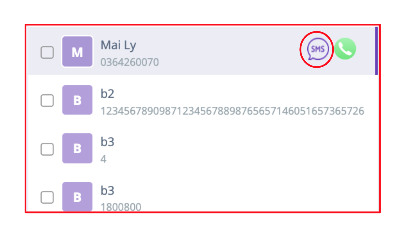 Sau khi add thành công, đăng nhập vào tổng đài khách hàng, rê chuột vào từng SĐT sẽ xuất hiện icon SMS bên cạnh icon click2call.