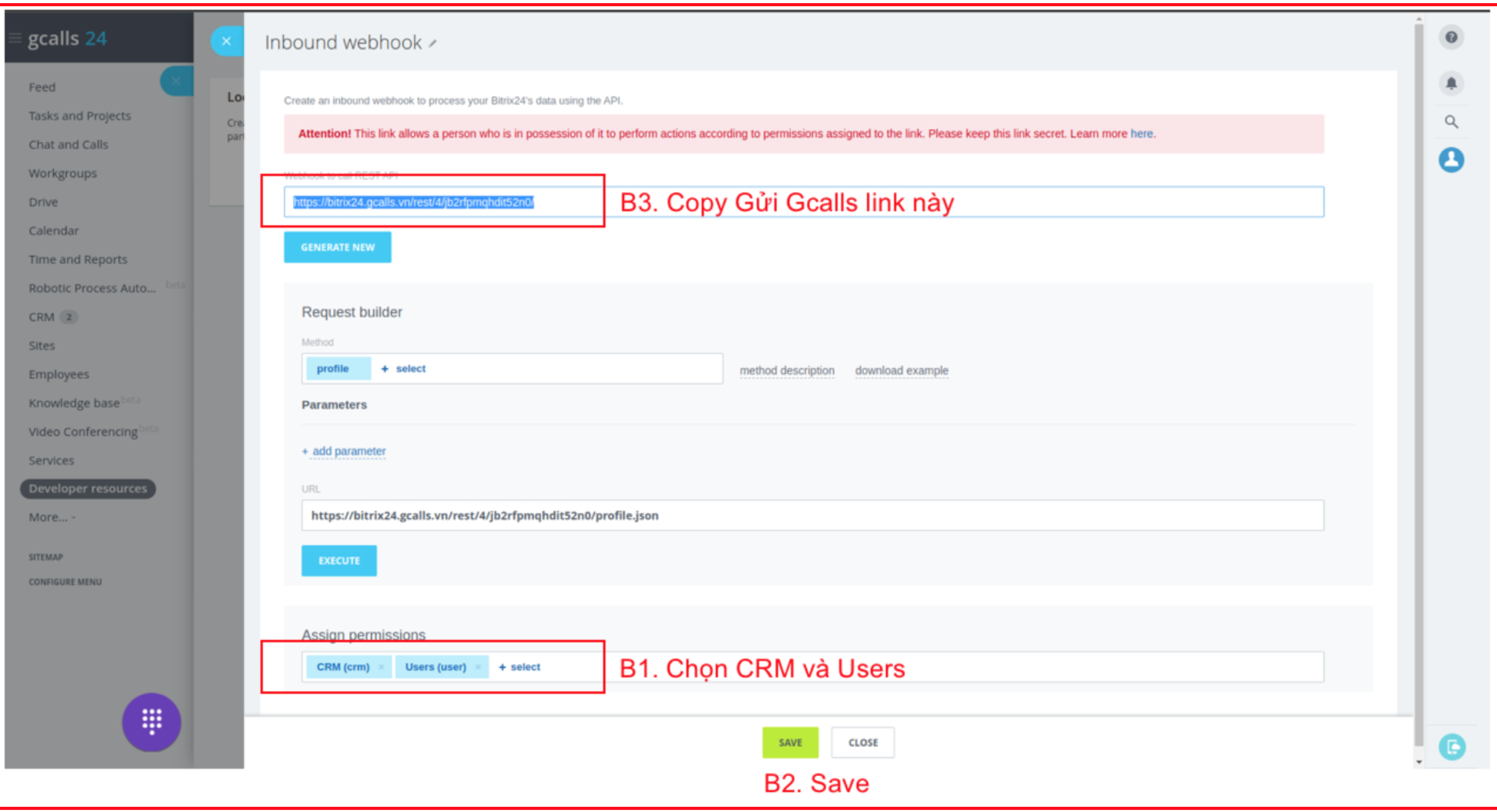 - Tại Assign permissions -> chọn CRM và User -> save -> gửi mình lại link webhook (link được tô đậm trong hình)