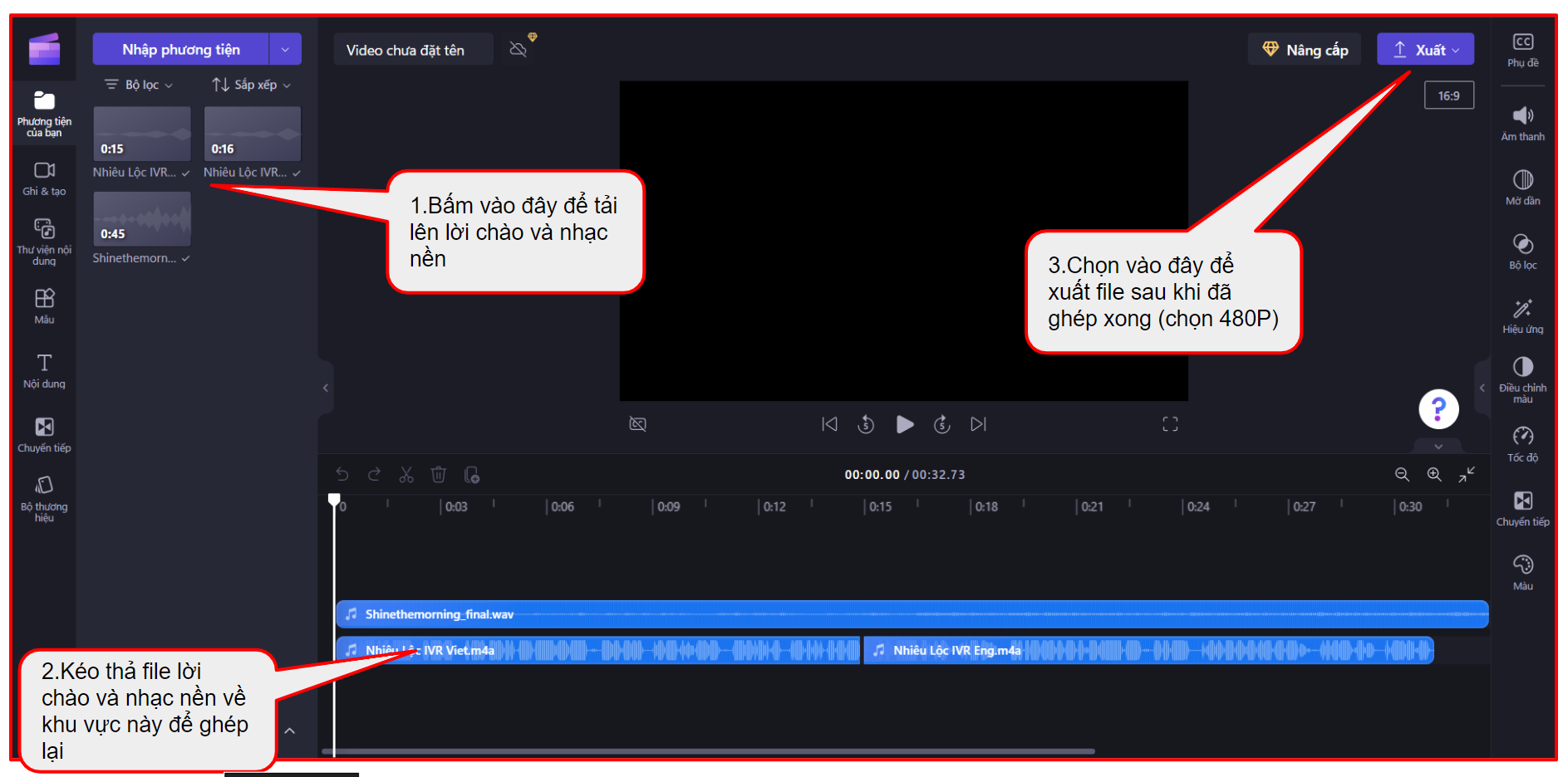 - Khi lồng nhạc nền cho lời chào, lưu ý nhạc nên phải nhỏ hơn và không được át đi lời chào.