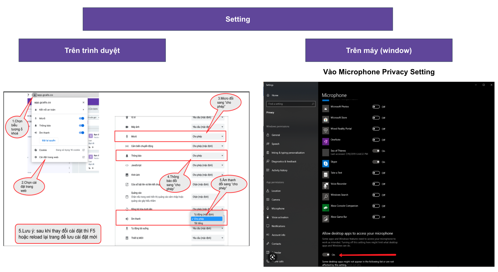CS khi training KH cần nhắc lại các vấn đề trên trong slide training của mình.Ngoài ra, CS cũng cần trao đổi kỹ về việc các khách hàng phải luôn luôn kiểm tra setting cho phép Micro, Âm thanh, Thông báo như bên dưới