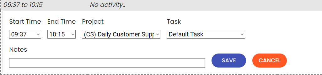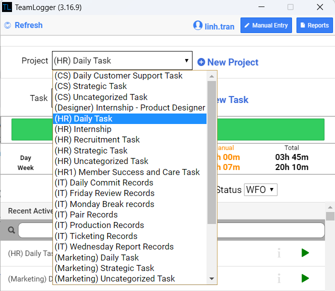 Tương tự như Project, nhân sự chọn các Task cần thực hiện. Đối với các task mới, nhân sự lựa chọn "NEW TASK" để điền tên task, các tên Task này sẽ được lưu lại, cho phép nhân sự sử dụng lại khi cần tiếp tục thực hiện task.