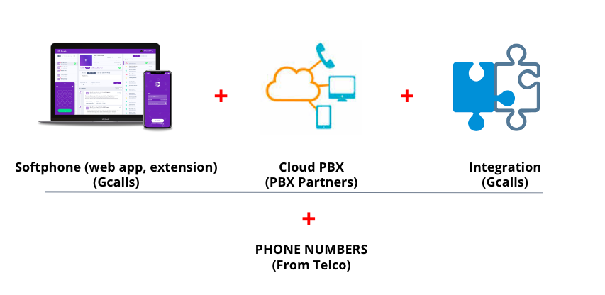 - Phần lõi - Cloud PBX (Private Branch Exchange): là một hệ thống điện thoại trên đám mây dành cho doanh nghiệp. Thay vì sử dụng phần cứng tổng đài truyền thống, Cloud PBX sử dụng dịch vụ VoIP để cung cấp tính năng gọi đi, gọi đến qua mạng Internet. Điều này mang lại sự linh hoạt, tiết kiệm chi phí và quản lý dễ dàng. Cloud PBX cho phép doanh nghiệp mở rộng và tích hợp dễ dàng, cung cấp một hệ thống điện thoại hiệu quả và tiện lợi cho các hoạt động kinh doanh. Nói dễ hiểu hơn Gcalls sẽ dùng hệ thống này để cấu hình tổng đài cho khách hàng từ kịch bản, kết nối IP,... mọi thứ liên quan đến kỹ thuật phía sau mà Khách hàng không biết/thấy nhưng được tích hợp với Softphone Gcalls để cho khách hàng sử dụng trên giao diện thân thiện nhất.