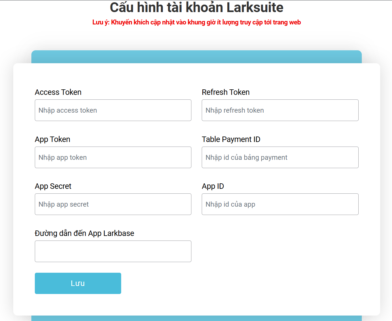 - Lưu ý với Larkbase: cần duy trì access_token thường xuyên để tránh mất kết nối.