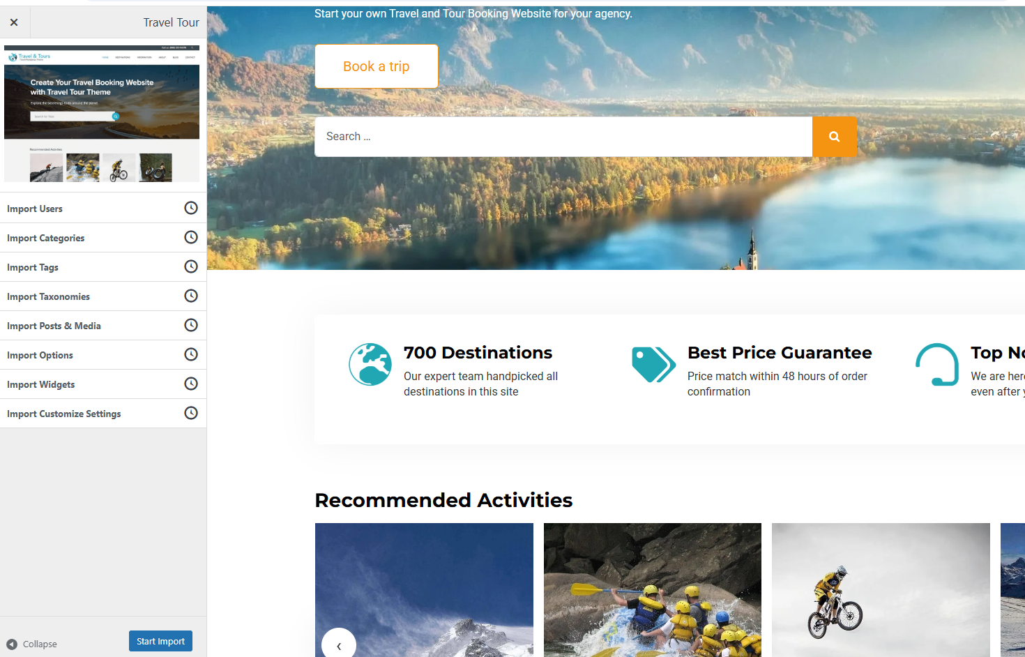 Tiếp tục chọn vào Travel Tour tương ứng để tiến hành cài đặt toàn bộ theme, tiến hành import data vào trang.