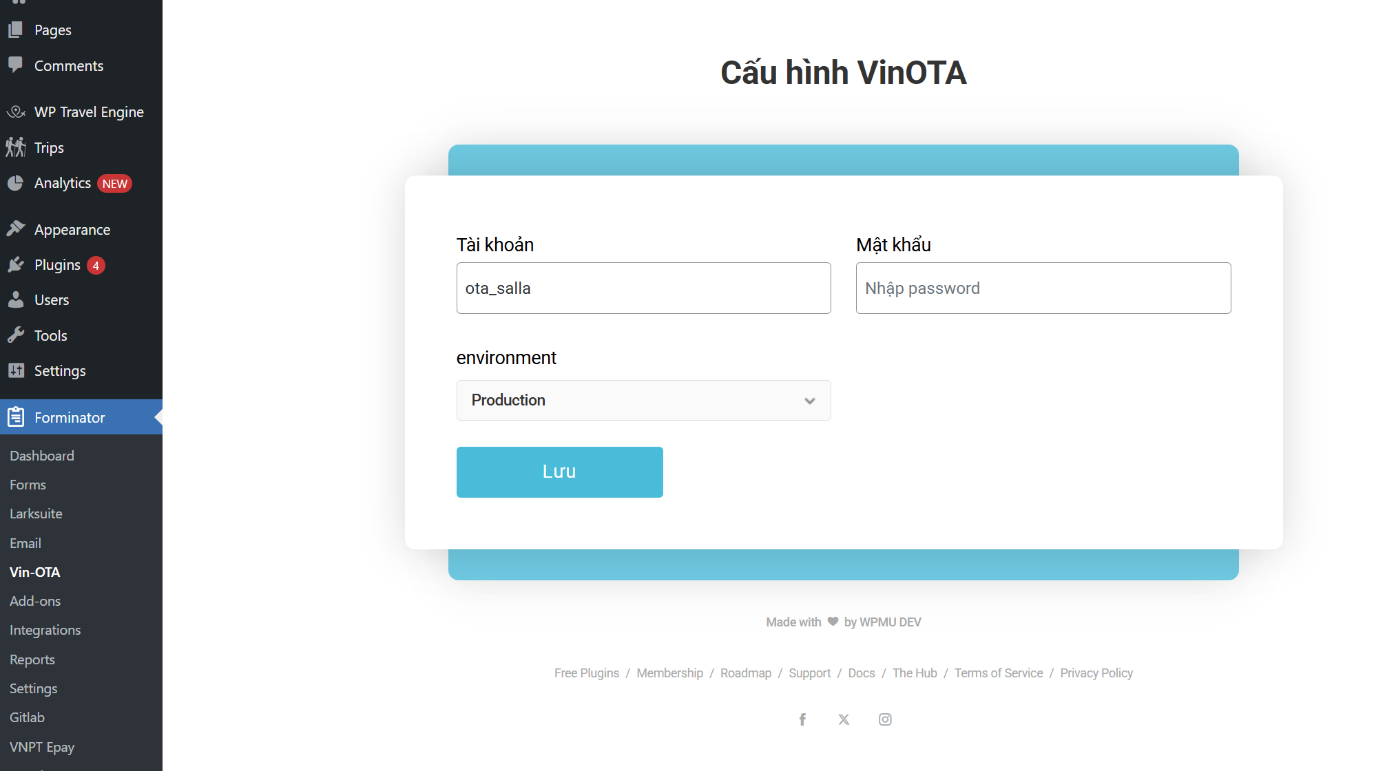 Vào mục Vin-OTA -> Nhập thông tin tài khoản và mật khẩu được giao cho admin từ team Vin-wonders -> Chọn lưu