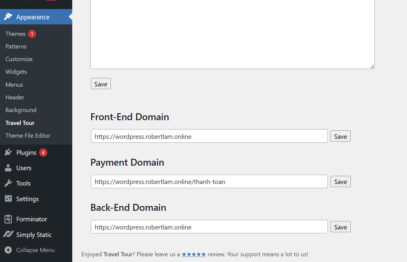 Bước hai: Vào đường dẫn /wp-admin/themes.php?page=travel-tour&tab=setting_page. Tiến hành thêm các thông tin như hình ảnh, bài viết