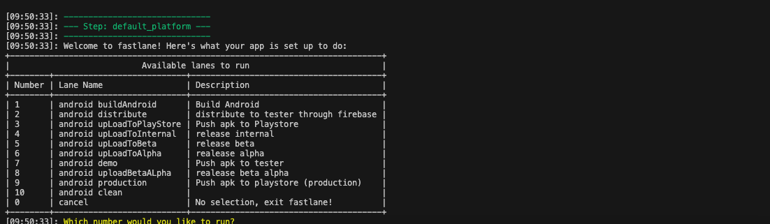 Vào thư mục android và gõ lệnh fastlane, sau đó chọn lane cần build