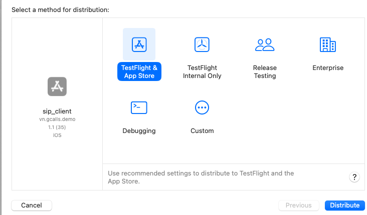 Bước 3: Chọn TestFlight & App Store và bấm Distribute
