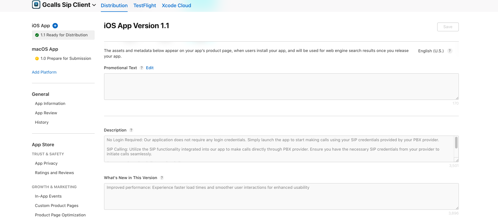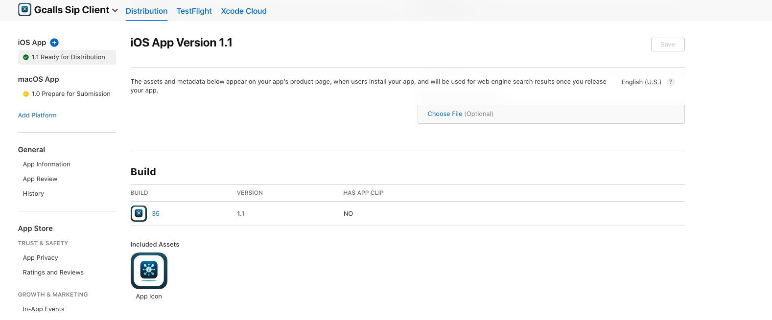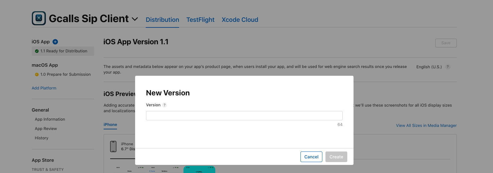 Bước 5: Ở mục iOS App , bấm vào dấu (+), nhập version trùng với version trên Xcode để chuẩn bị update version mới lên store