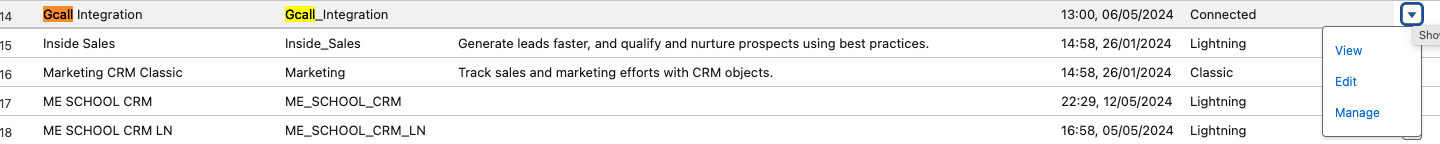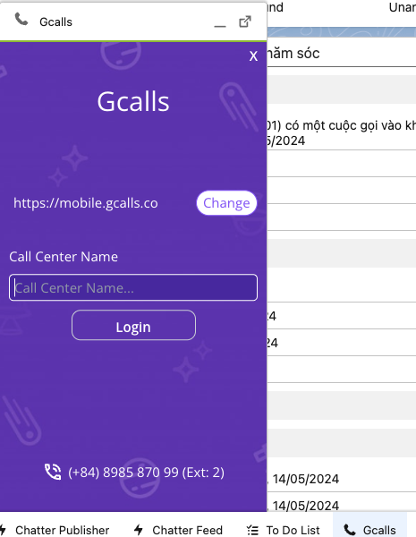 Vào https://portal.gcalls.vn > Customer > Integration > Search 'salesforce' > Chọn "eye" icon > cLick Add integrator