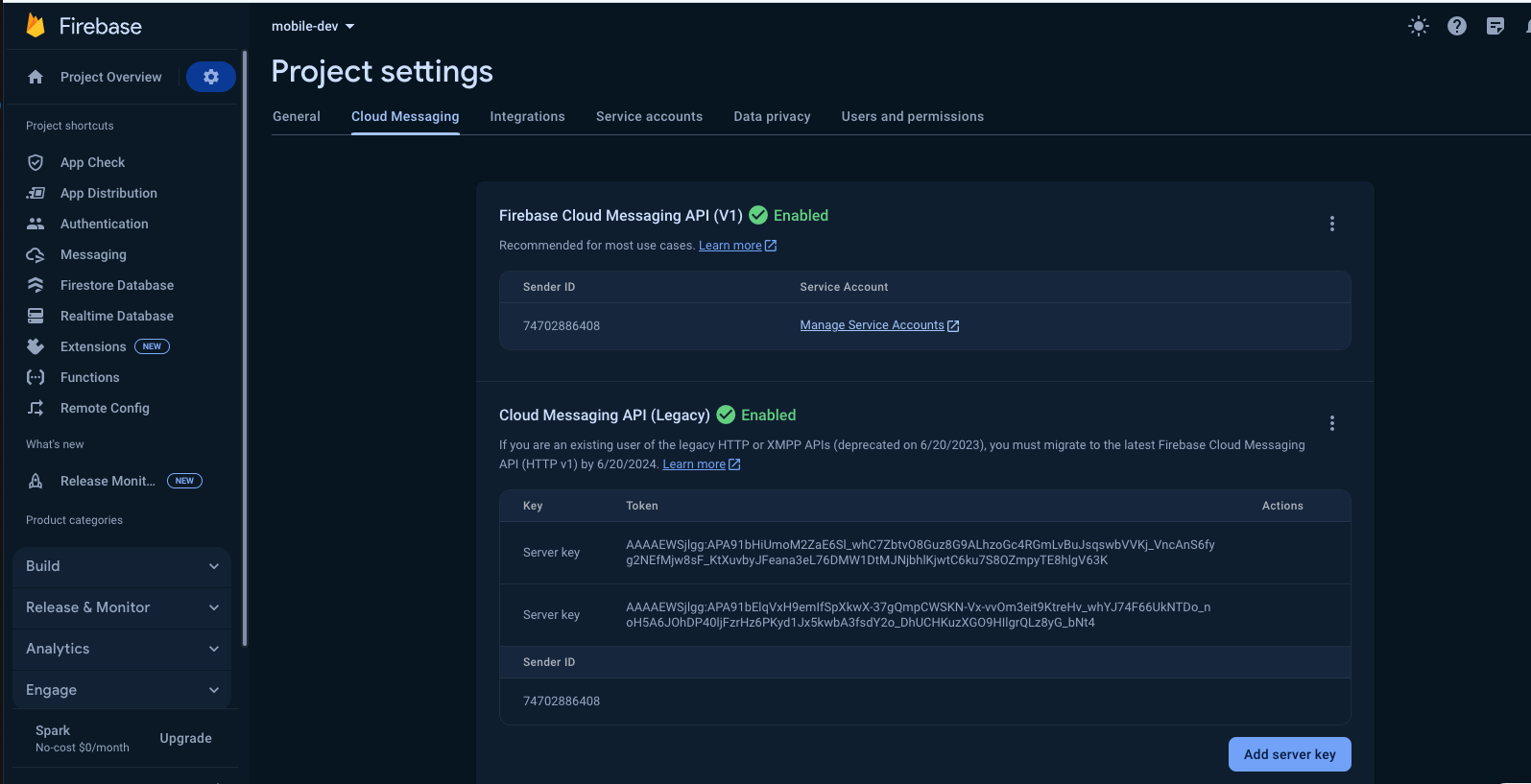 - Vào project setting -> Cloud Messaging bấm vào Add Server Key