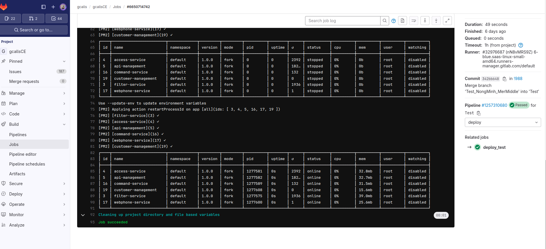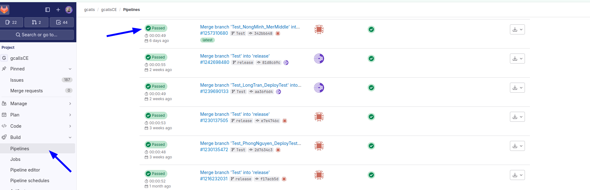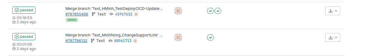 Sau khi merge vào Test branch, kiểm tra Pipelines đã run thành công. Nếu không thành công thì kiểm tra lỗi và làm lại "Bước 2" hoặc run lại "Jobs"