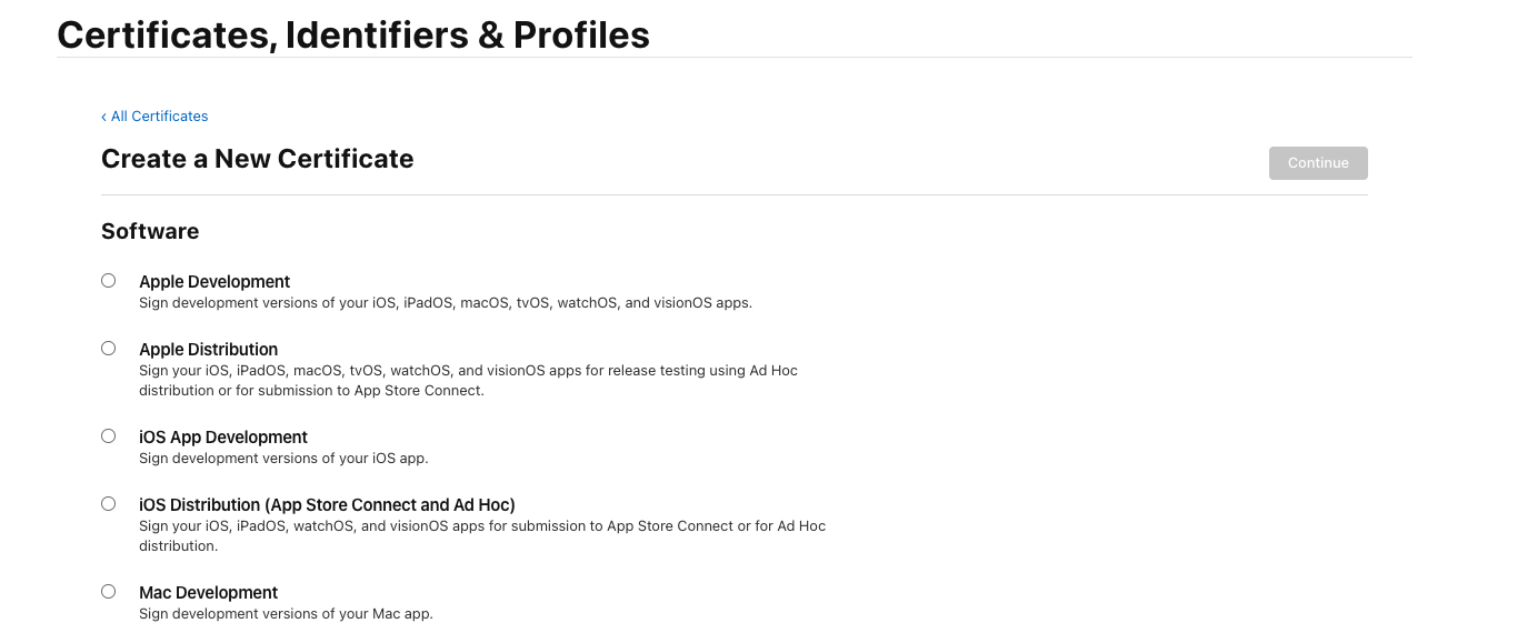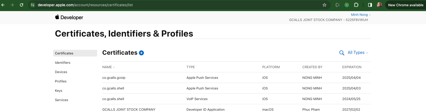 Bước 1: Vào tài khoản Apple, ở mục Certificates https://developer.apple.com/account/resources/certificates/list