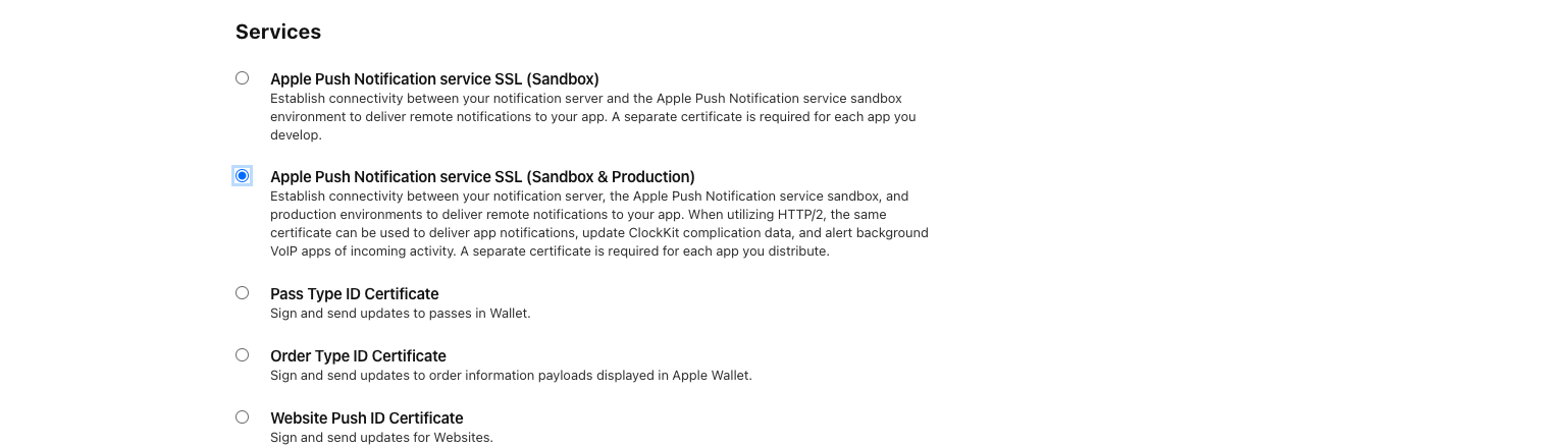Bước 2: Tạo certificate mới và chọn Apple Push Notification service SSL (Sandbox & Production)