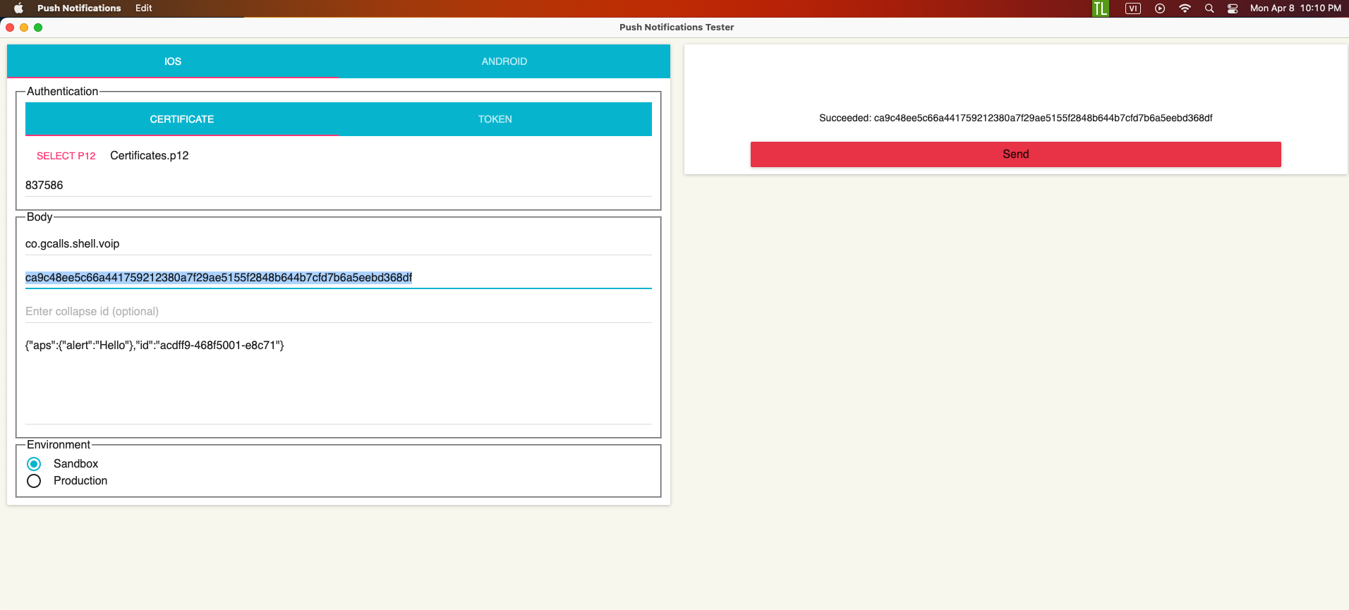 Bước 5: Sau khi đã setup Pushkit, dùng curl để Test hoặc Push Notification Tester APP và test với certificate .p12