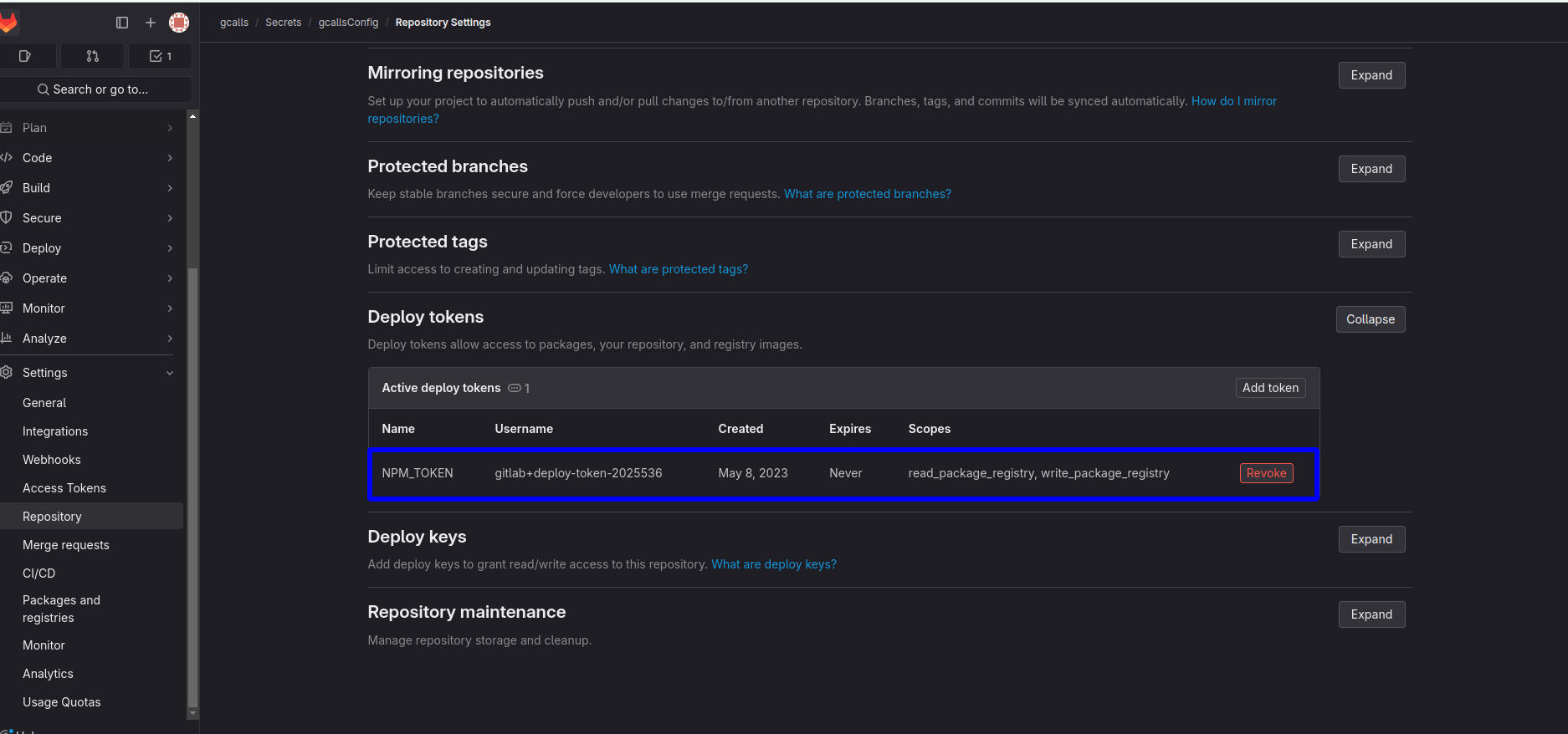- "Deploy tokens" được tạo và hiển thị giá trị một lần duy nhất tại (bạn có thể Revoke và tạo lại):