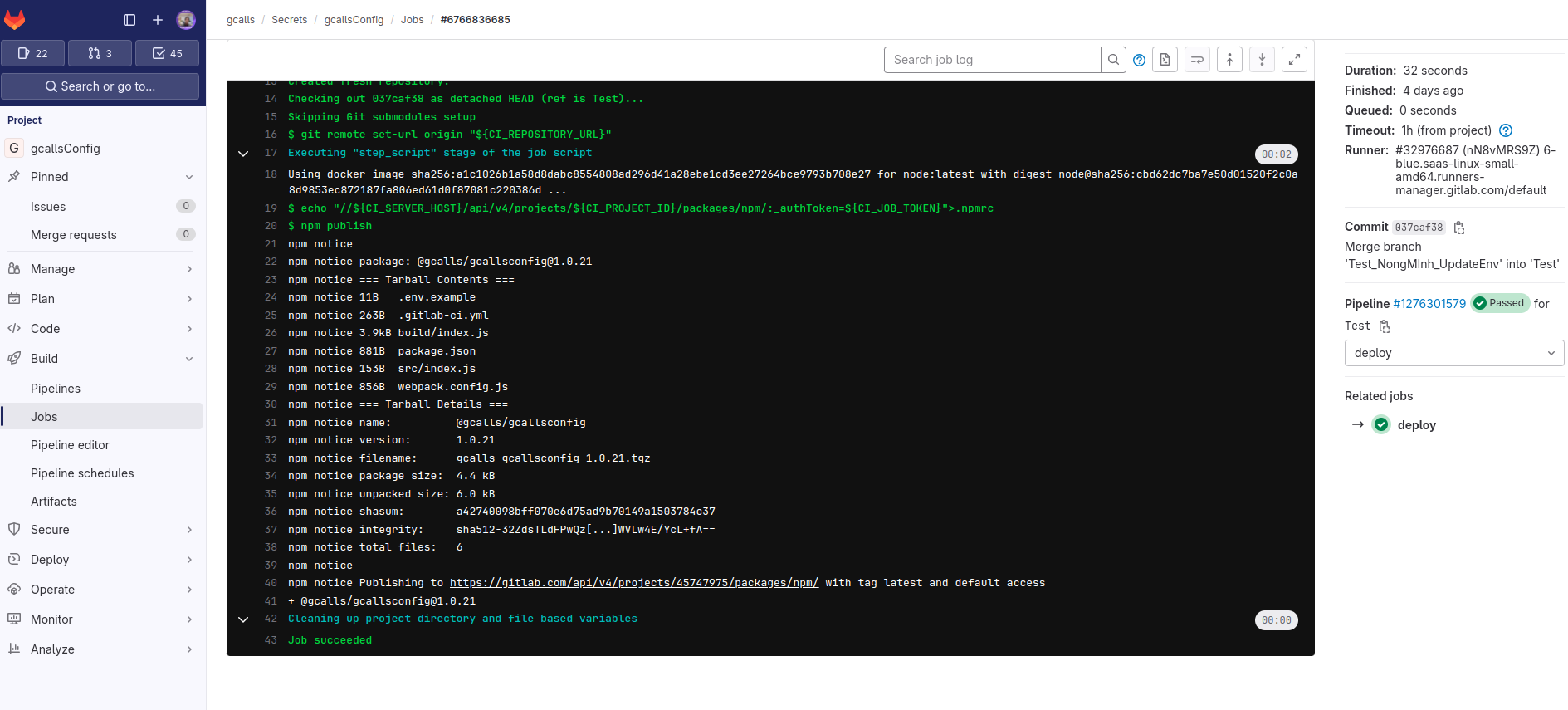 Sau khi merged vào Test, vào kiểm tra Pipelines đã run thành công.