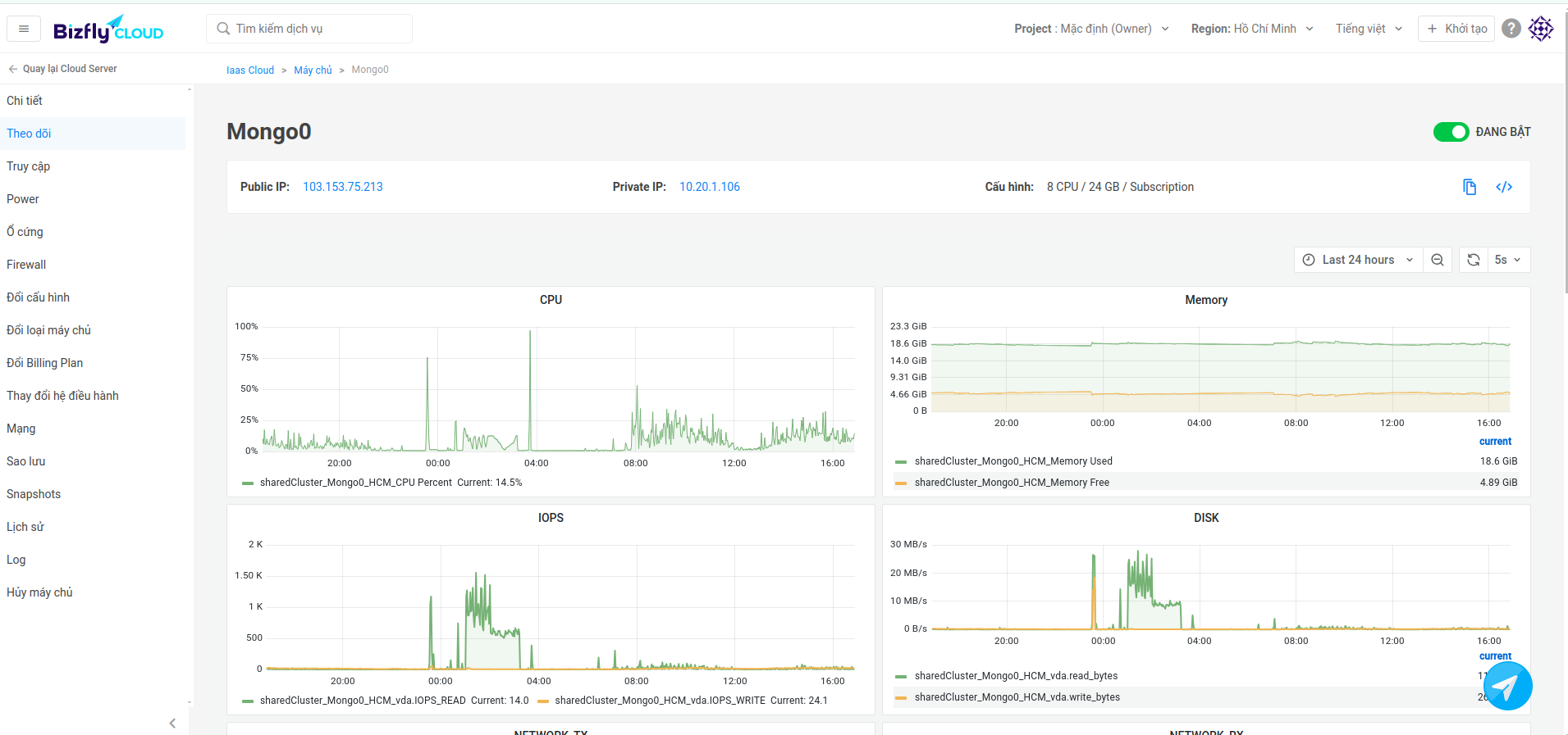 - Theo dõi Ram, CPU, SSD..v.v trên trình "Theo dõi" thời gian thực của Bizfly.