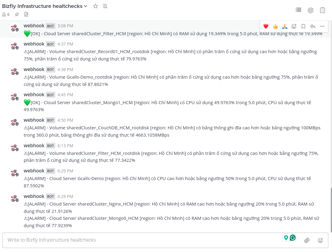 - Có 2 channels là Urgent Bizfly Infrastrtucture healtchecks và Bizfly Infrastructure healtchecks. Sẽ thông báo khi hệ thống server có tình trạng hoạt động vượt quá % cho phép.