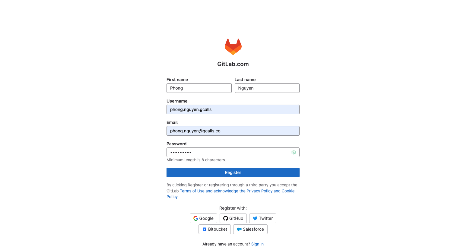 - Bạn phải sử dụng Email do công ty cung cấp để đăng ký tài khoản GitLab.