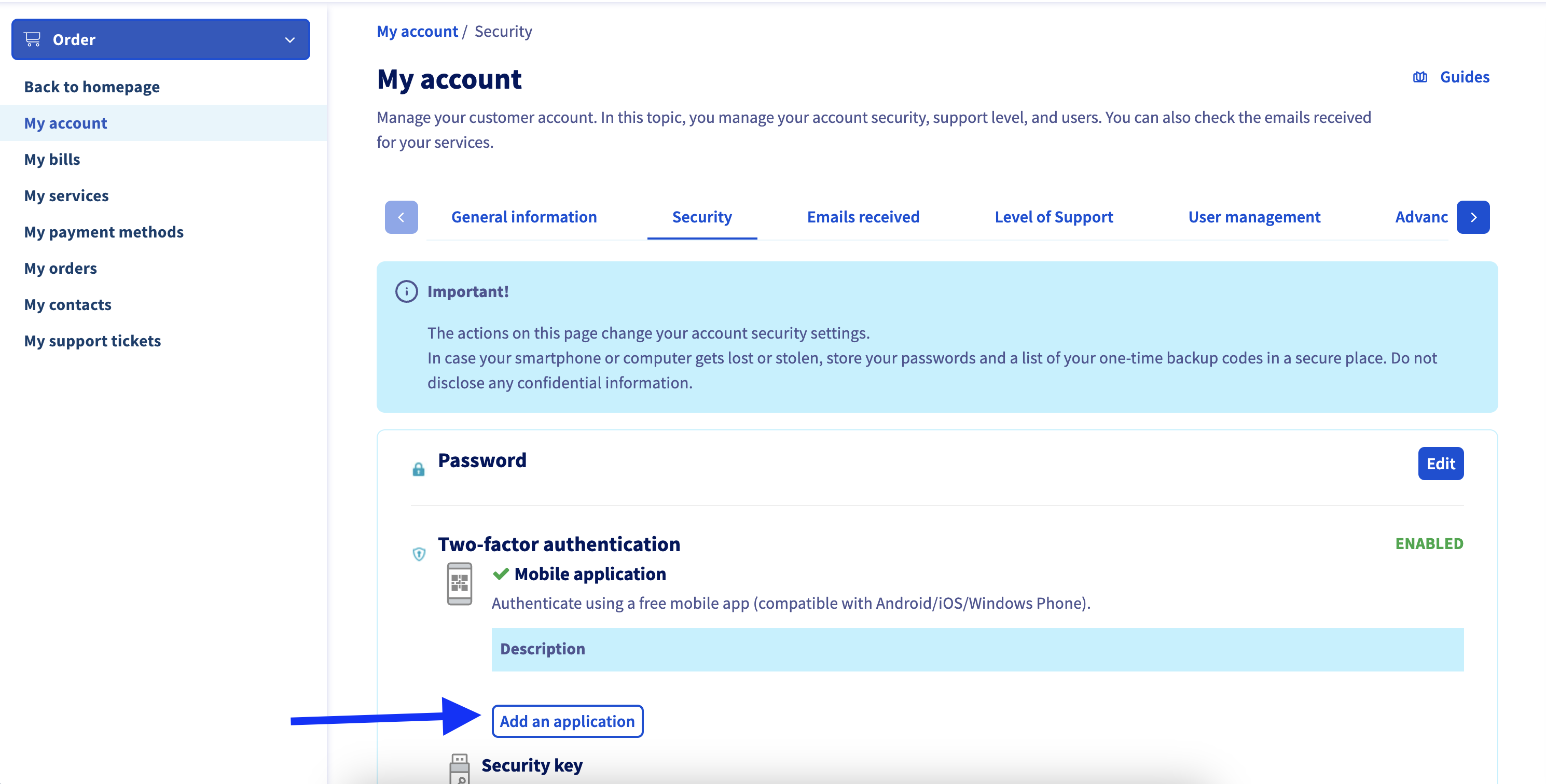 - Sau khi đăng nhập OVH thành công. Vào link sau để tạo mã OTP trên thiết bị của bạn: https://ca.ovh.com/manager/#/dedicated/useraccount/security