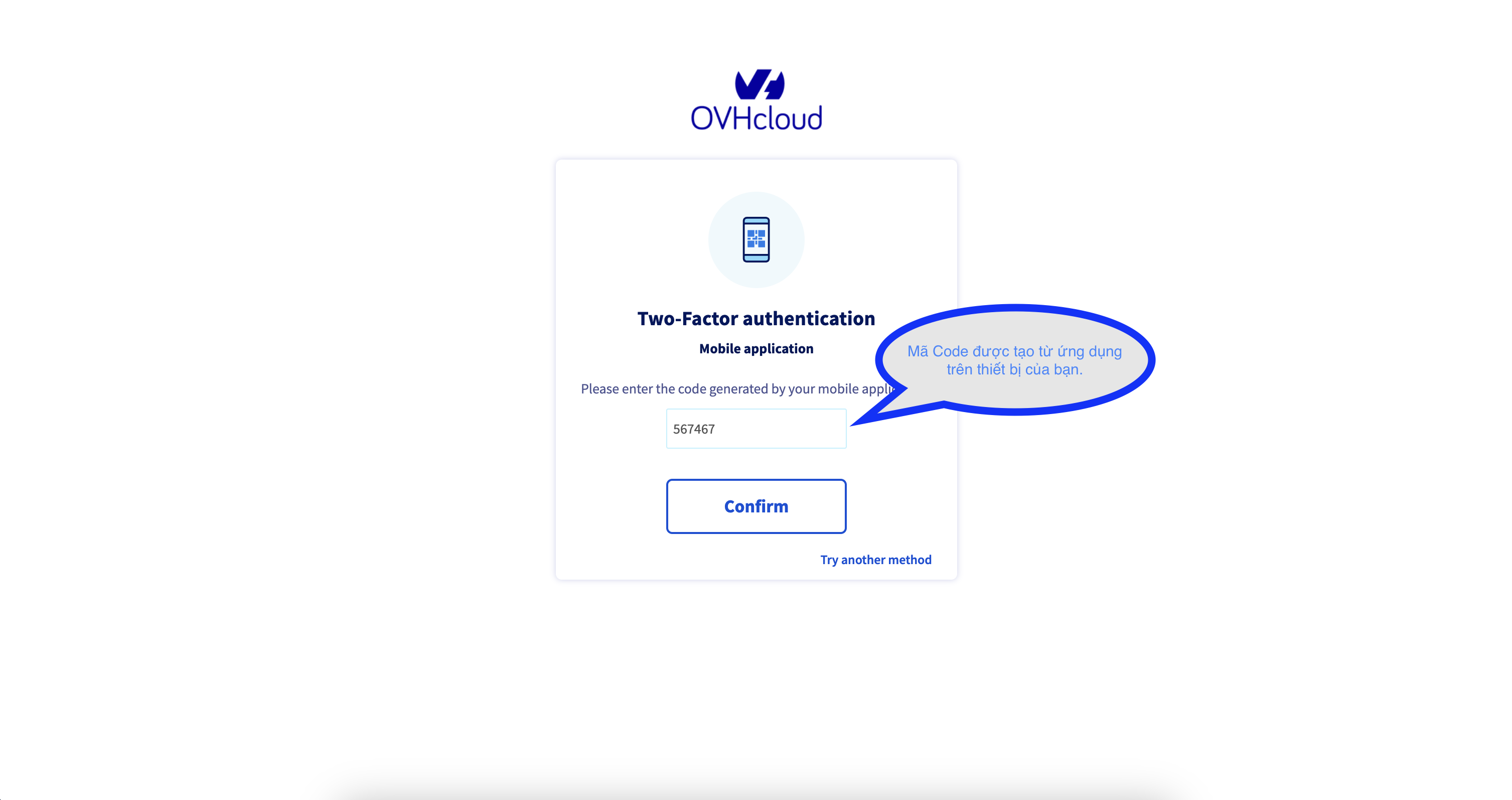 - Sau khi thiết lập thành công. Bạn đã có thể dùng mã OTP trên thiết bị để đăng nhập OVH.