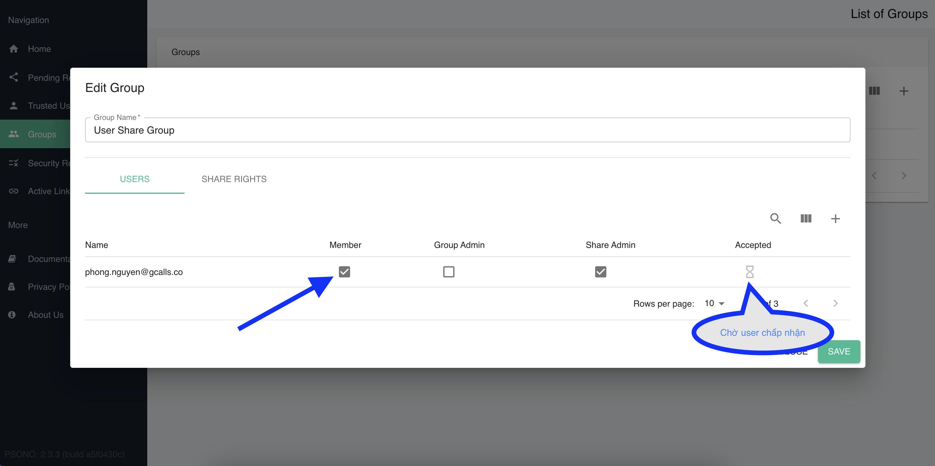 - Chọn trusted users mà bạn muốn thêm vào group -> chờ user chấp nhận