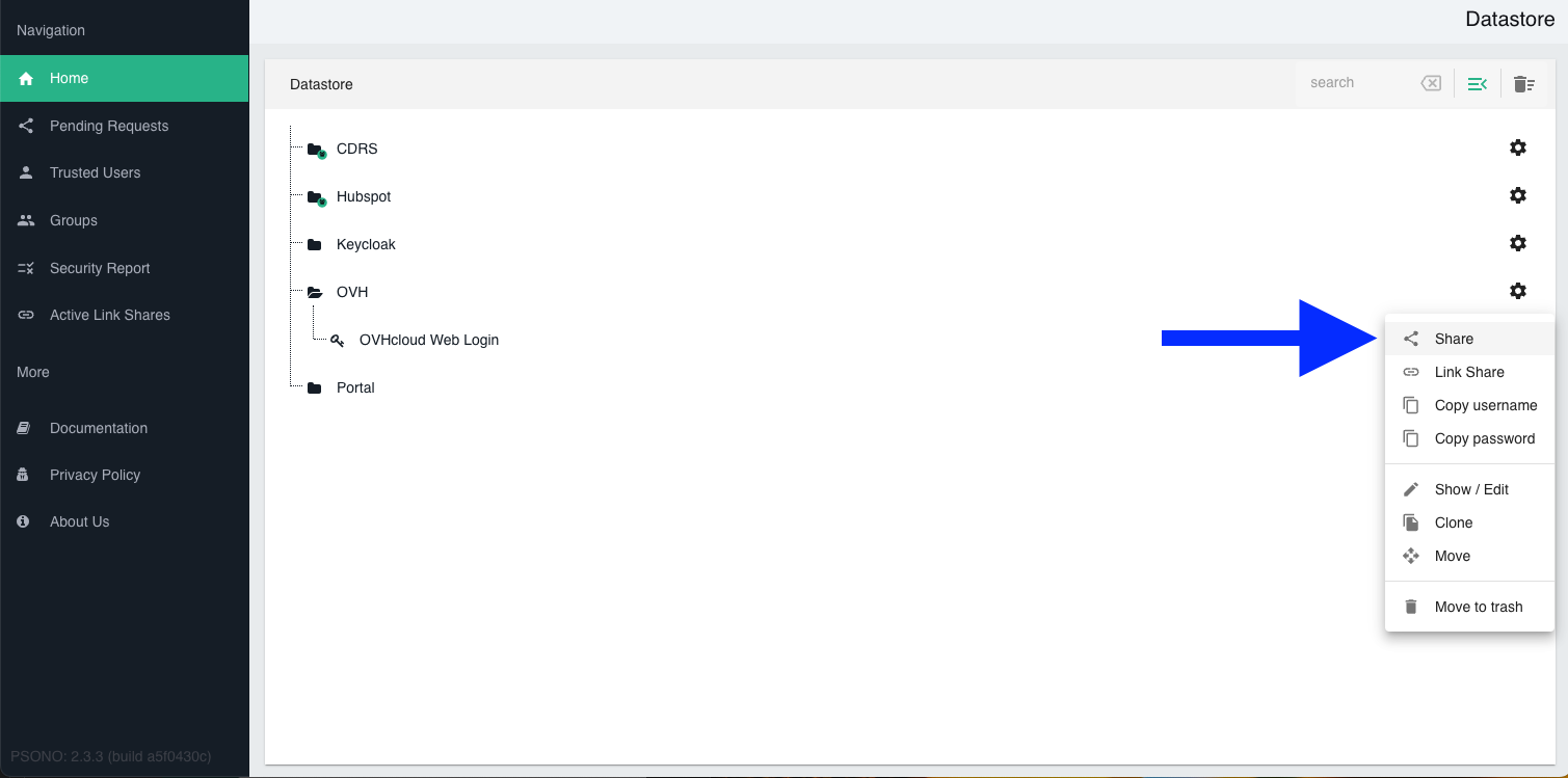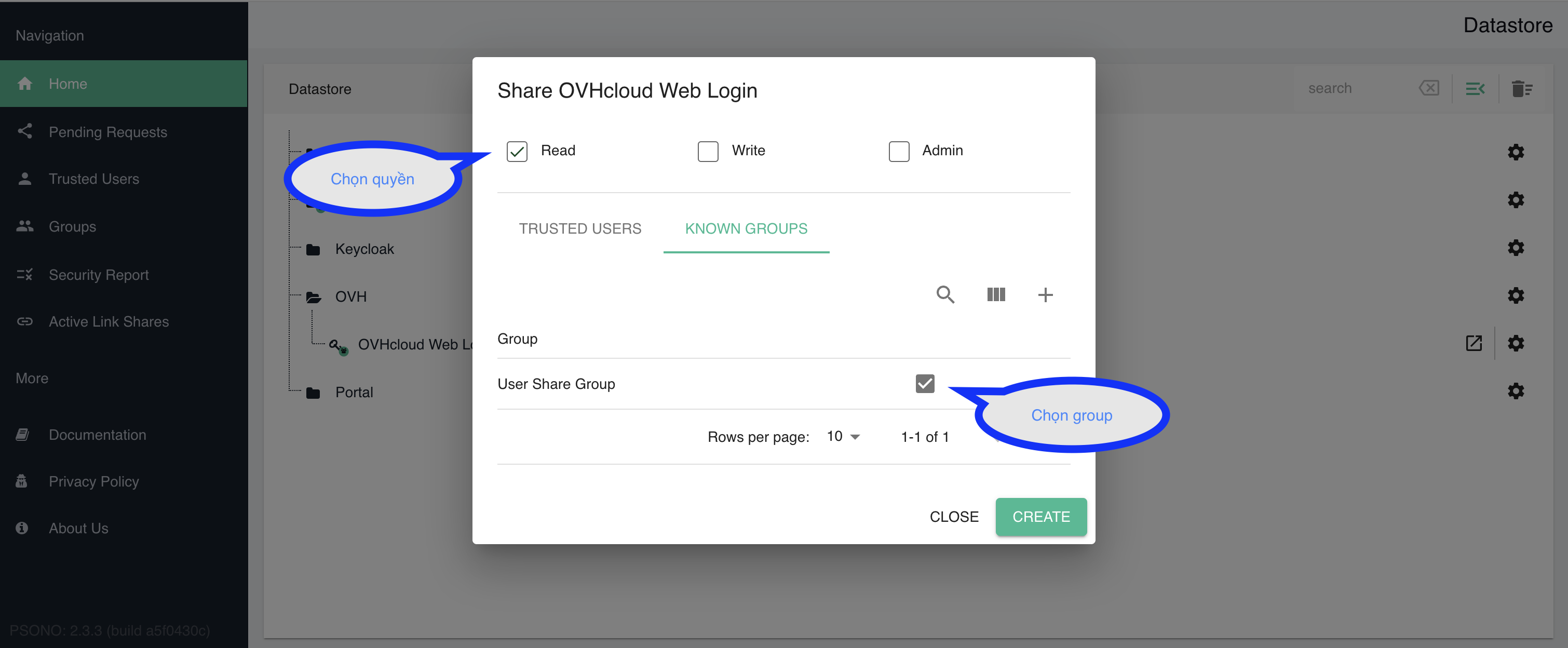 - Vào "Home" -> Chọn "Datastore" bạn muốn chia sẻ -> nhấn "Share"