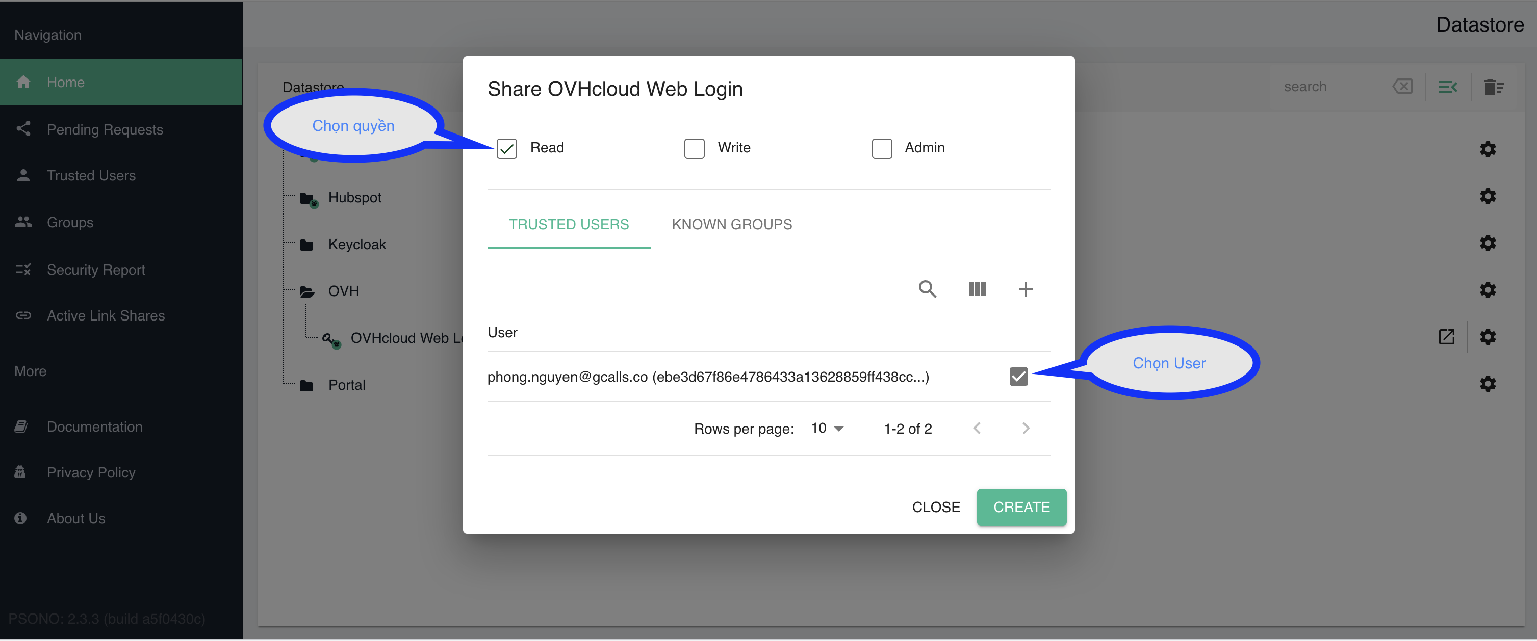 - Sau khi chia sẻ Datastore. User mà bạn chia sẻ có thể sử dụng thông tin này để đăng nhập vào hệ thống.