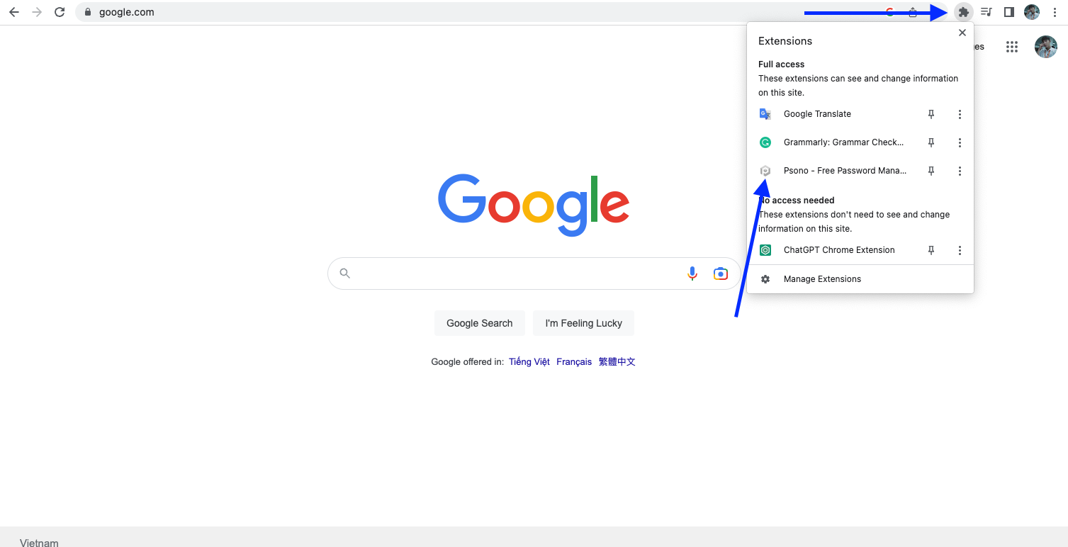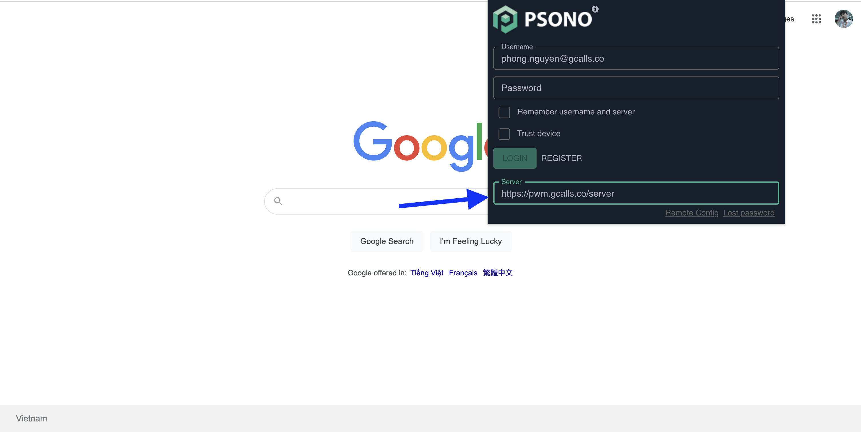 - Truy cập website cần đăng nhập và nhấn vào icon Psono