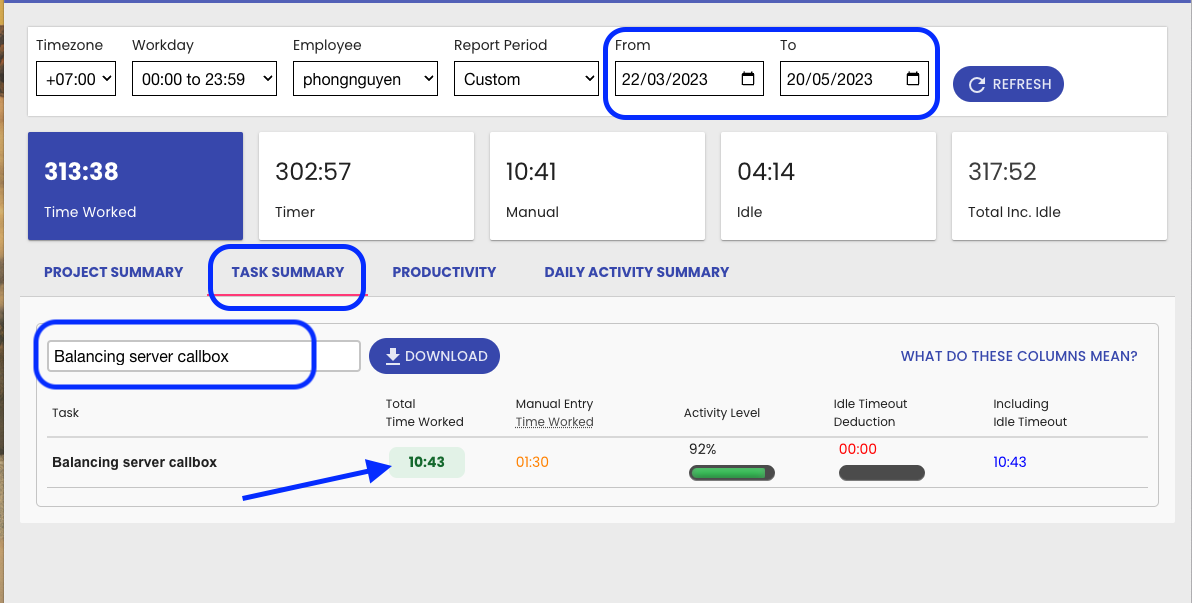 - Chọn tab "Task Summary" -> Chọn ngày From và To cần tạo report -> Tại input Search nhập tên task bạn muốn tạo report.